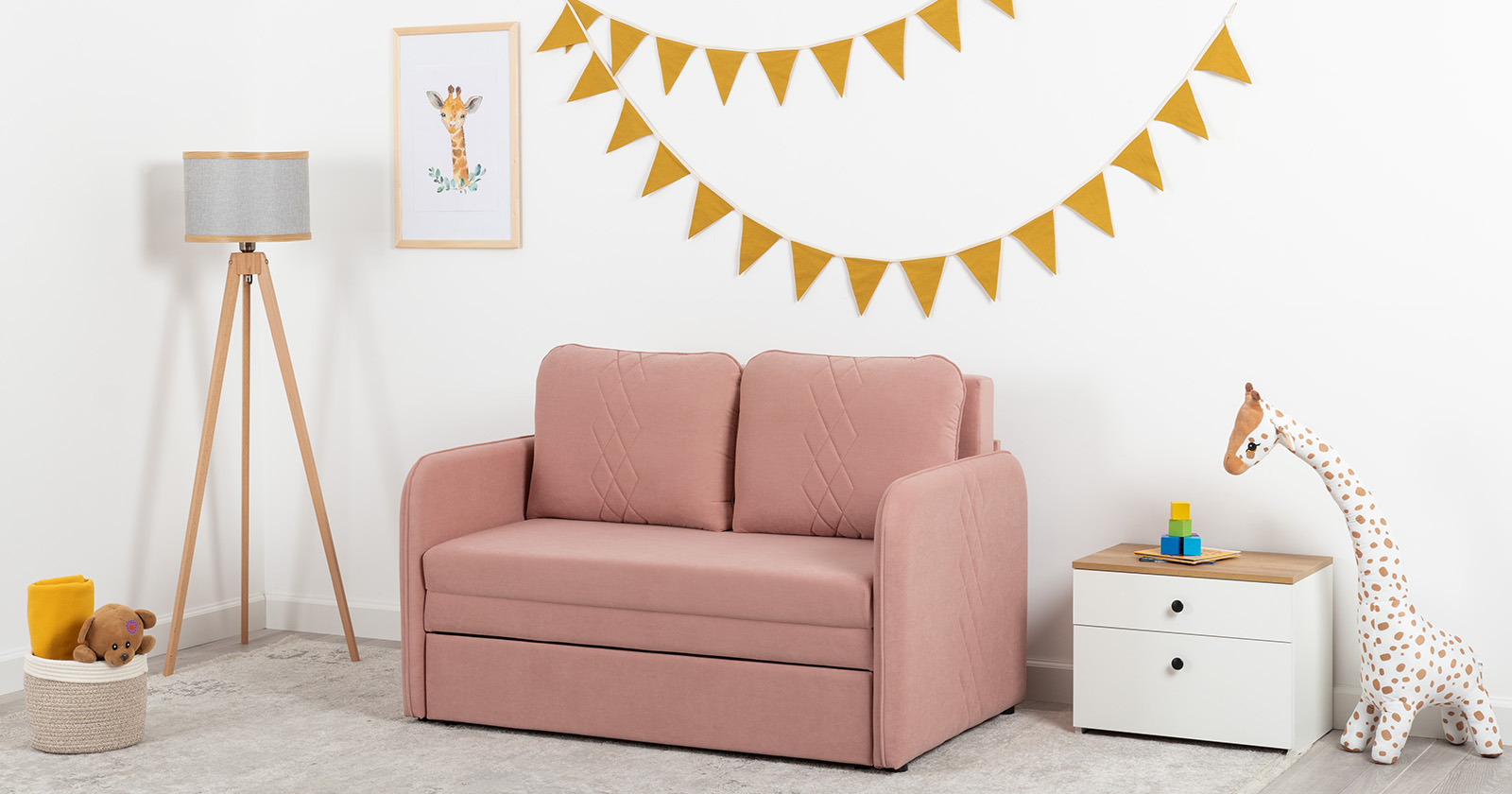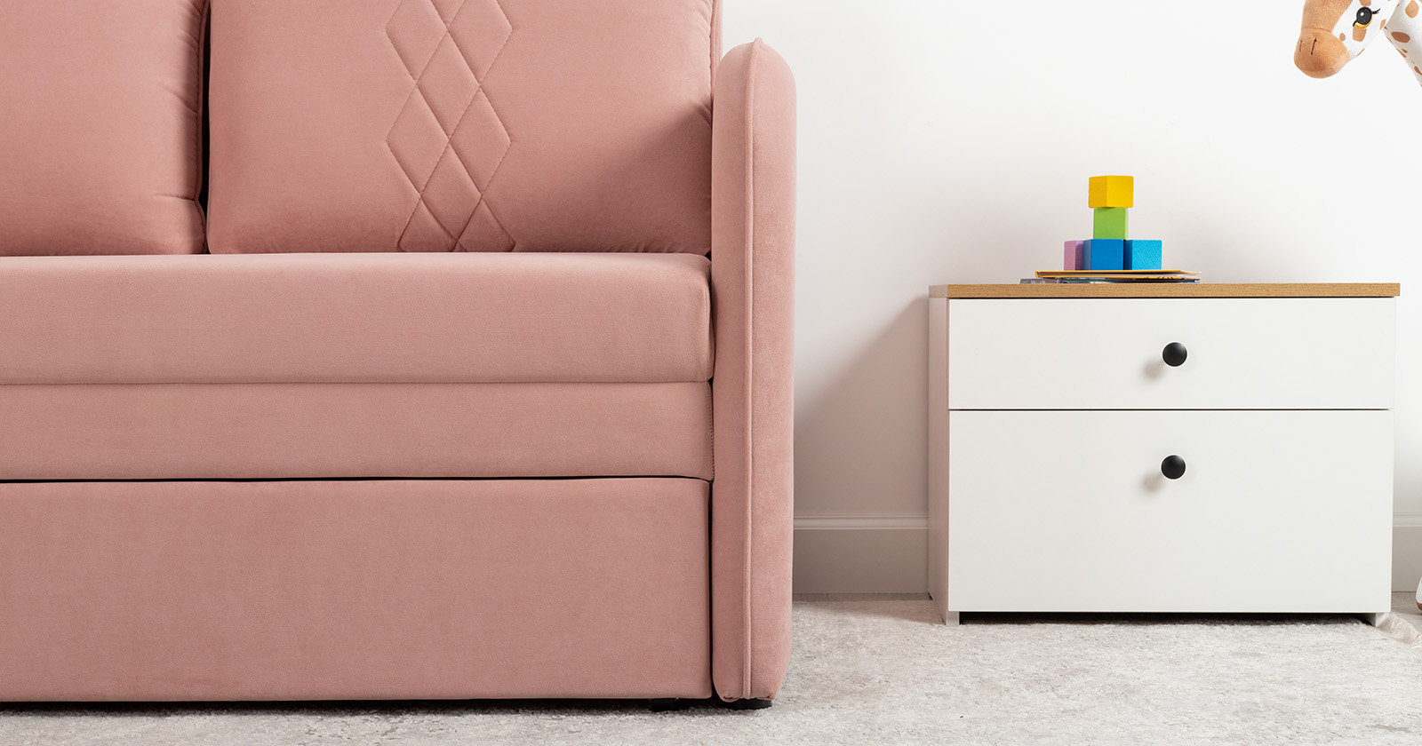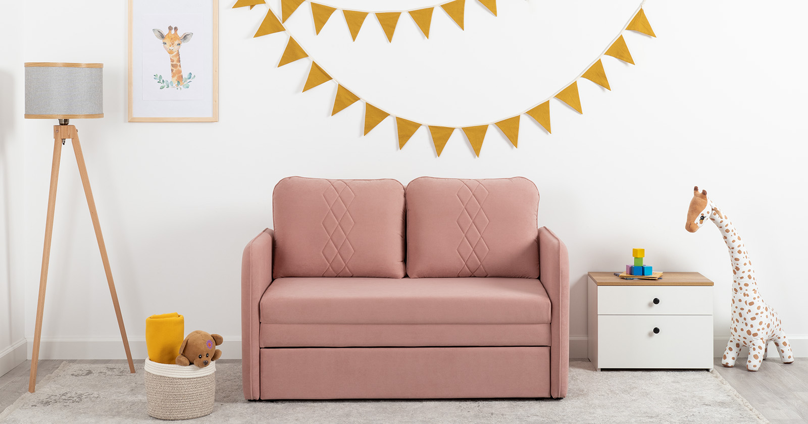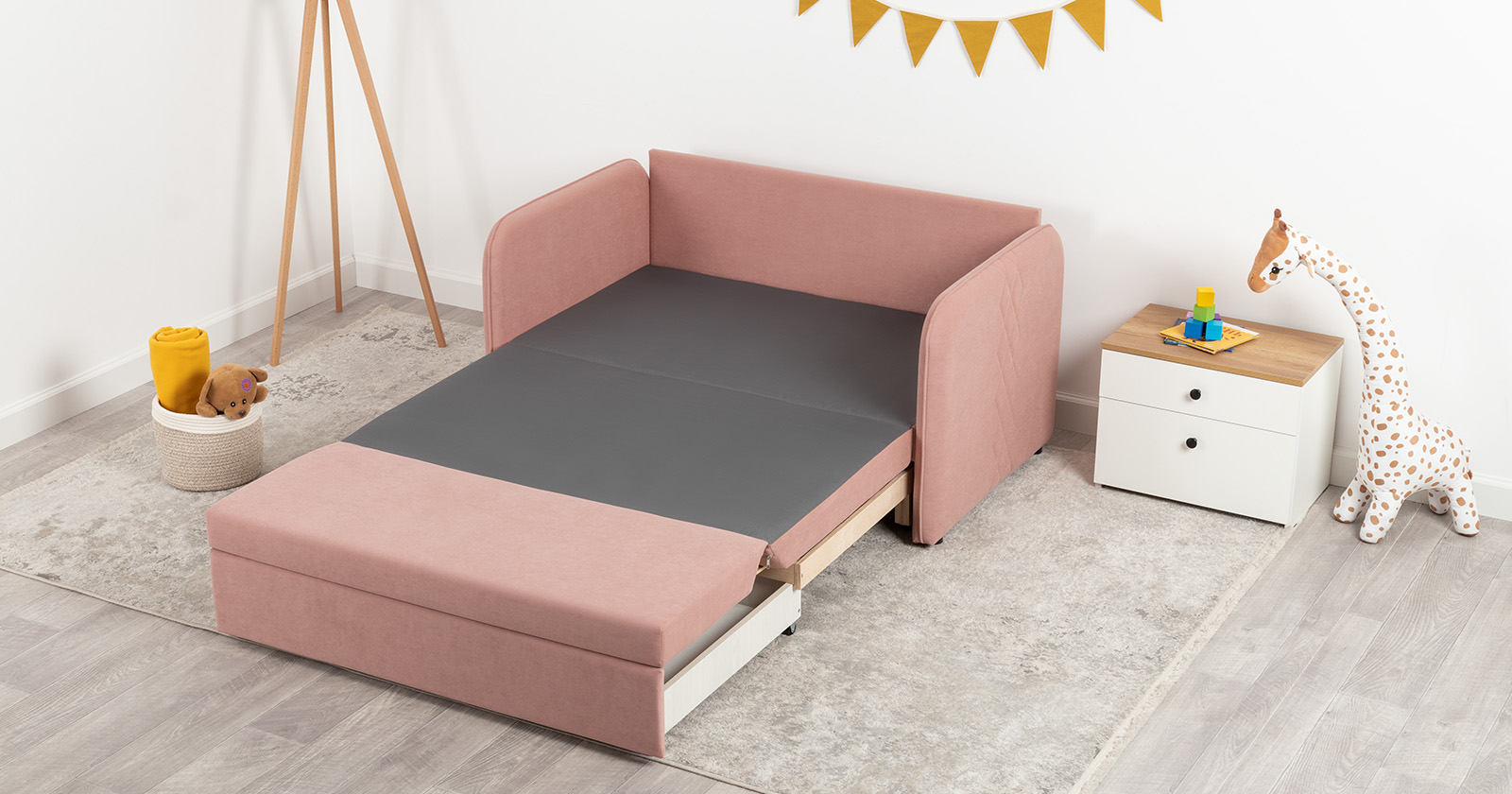 Стильный компактный диван для детской и гостиной. При своих скромных размерах он трансформируется в полноценное спальное место для детей и подростков. Лаконичный дизайн в виде декоративной стежки подчеркивает фактуру велюра, а небольшие размеры позволят разместить его в любом пространстве.