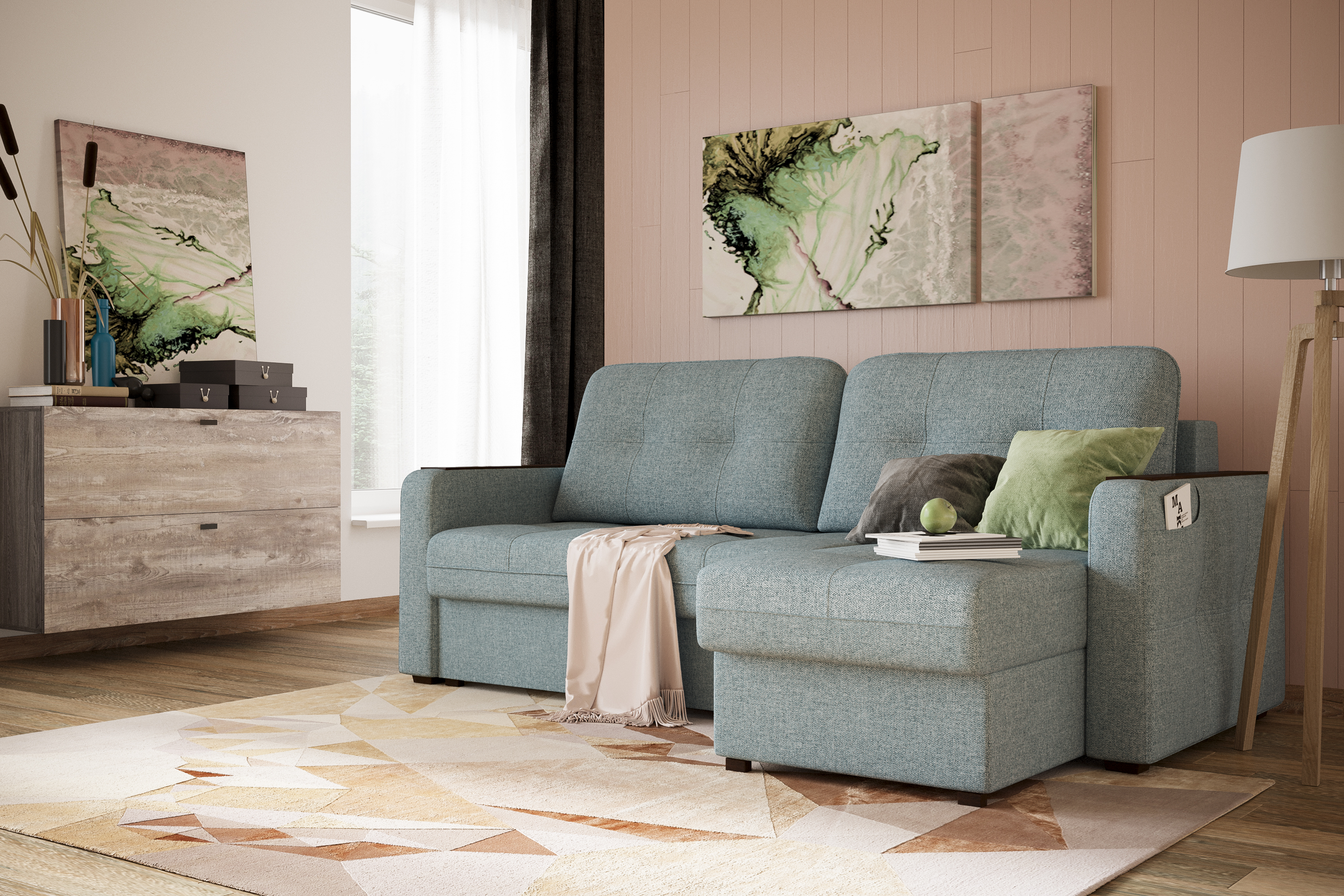 Угловой диван «SMART 3» с оттоманкой сделает отдых ещё удобнее, а интерьер наполнит уютом и комфортом. Модель с универсальным углом подойдет любителям часто менять обстановку. Для такой мебели легко найти новое место и изменить при этом всю планировку комнаты. Удобный механизм раскладывания "пантограф" не требует отодвигания дивана от стены и работает из стационарного положения дивана. Боковины оснащены накладками, что обеспечивает ровную поверхность, например, для чашки кофе. В карман, расположенный в подлокотнике, удобно положить ТВ-пульт или смартфон. В комплекте к дивану можно заказать кресло-кровать или кресло с бельевым ящиком.