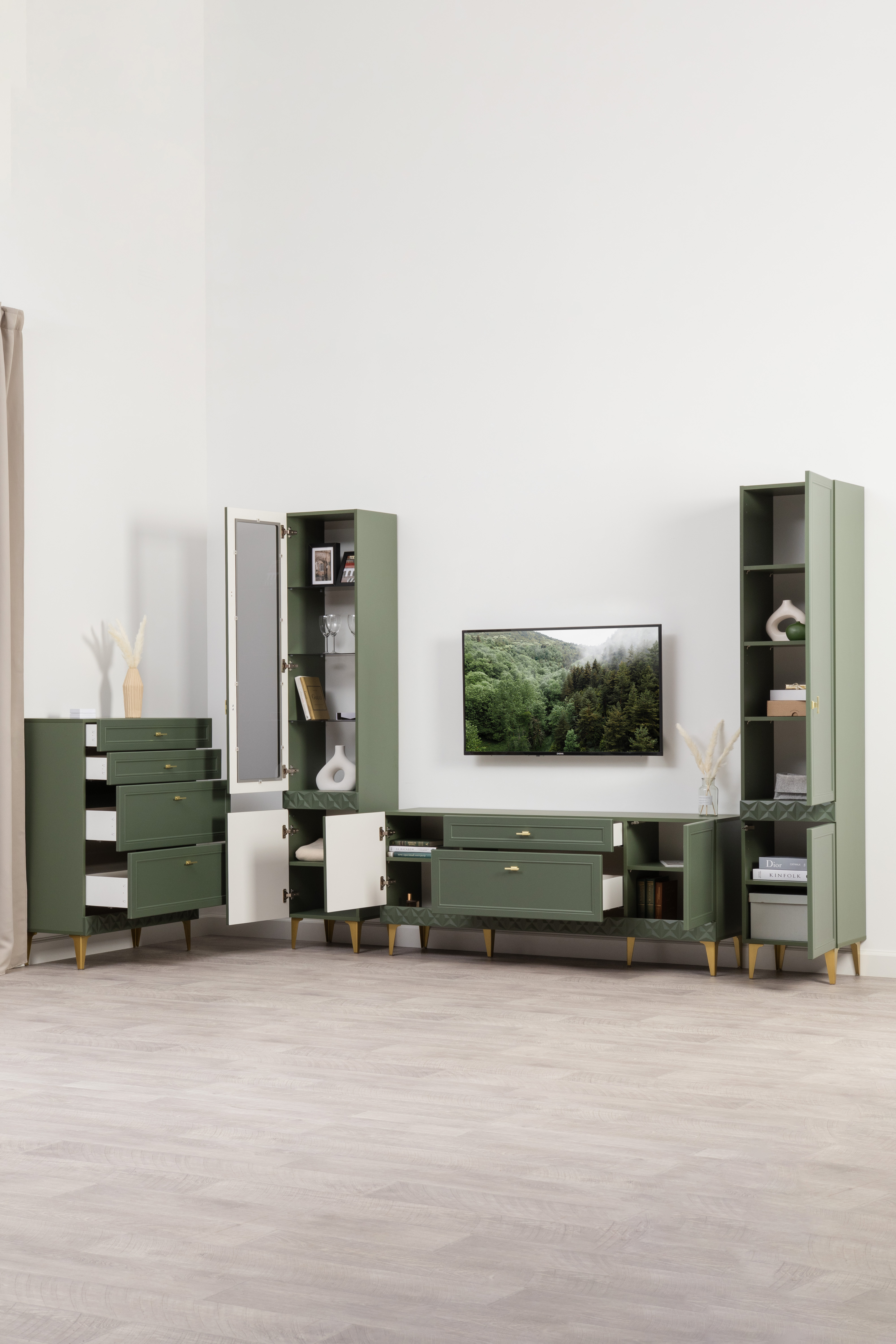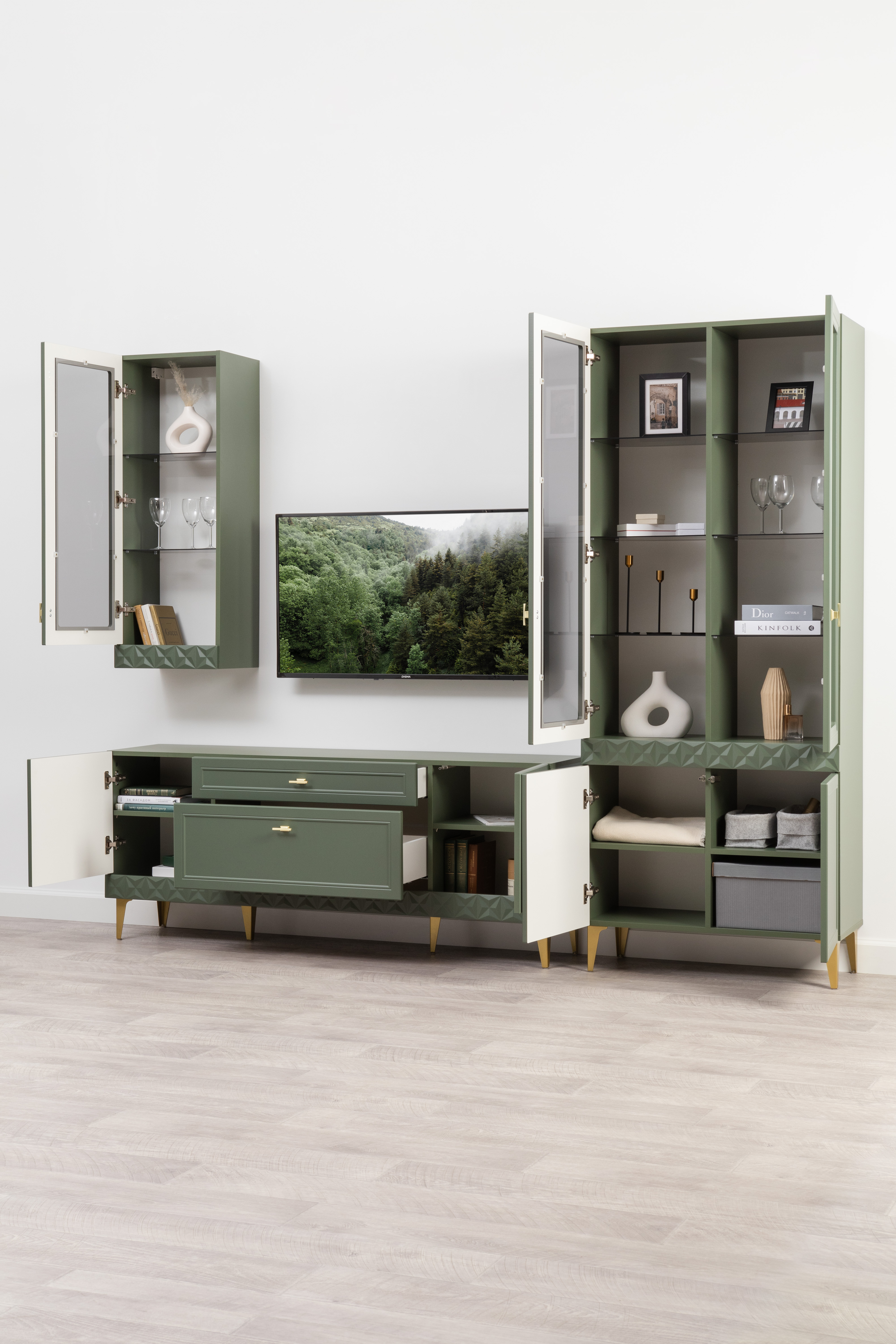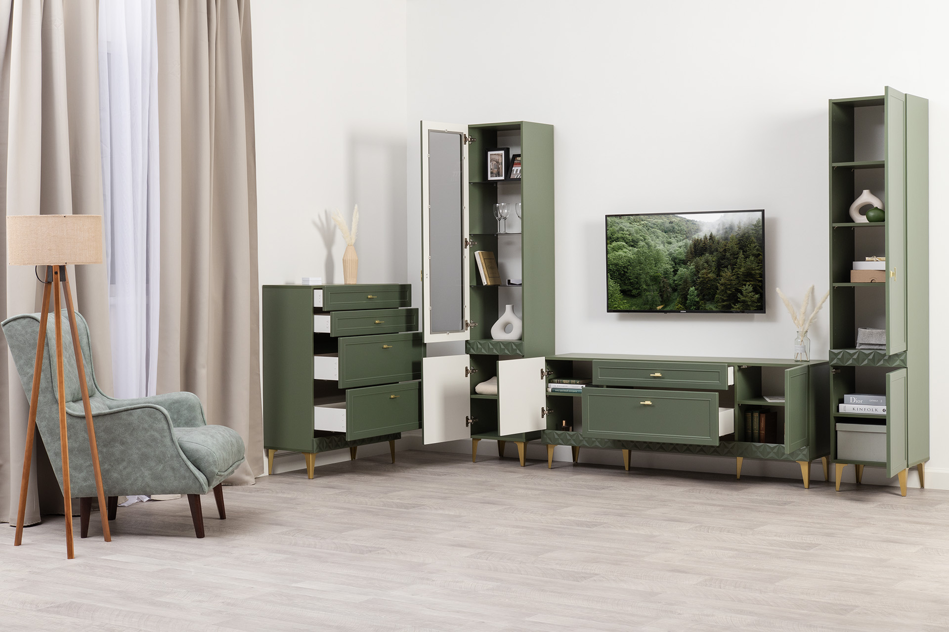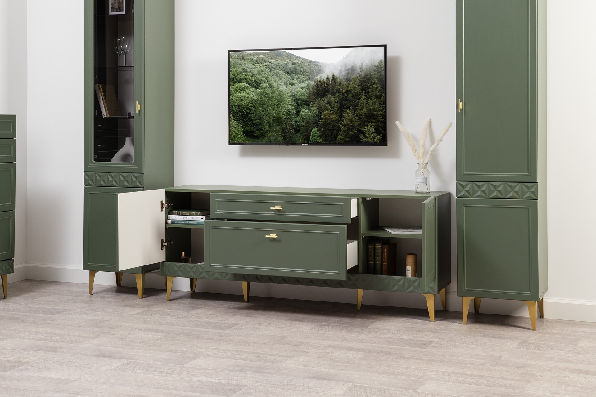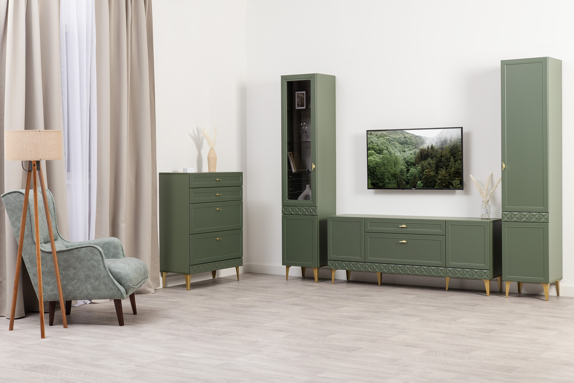 Гостиная Марион композиция 2 дымчатый зеленый K521, олива шагрень AG 1050 ПВХ, белый PE шагрень (собирается на любую сторону)
