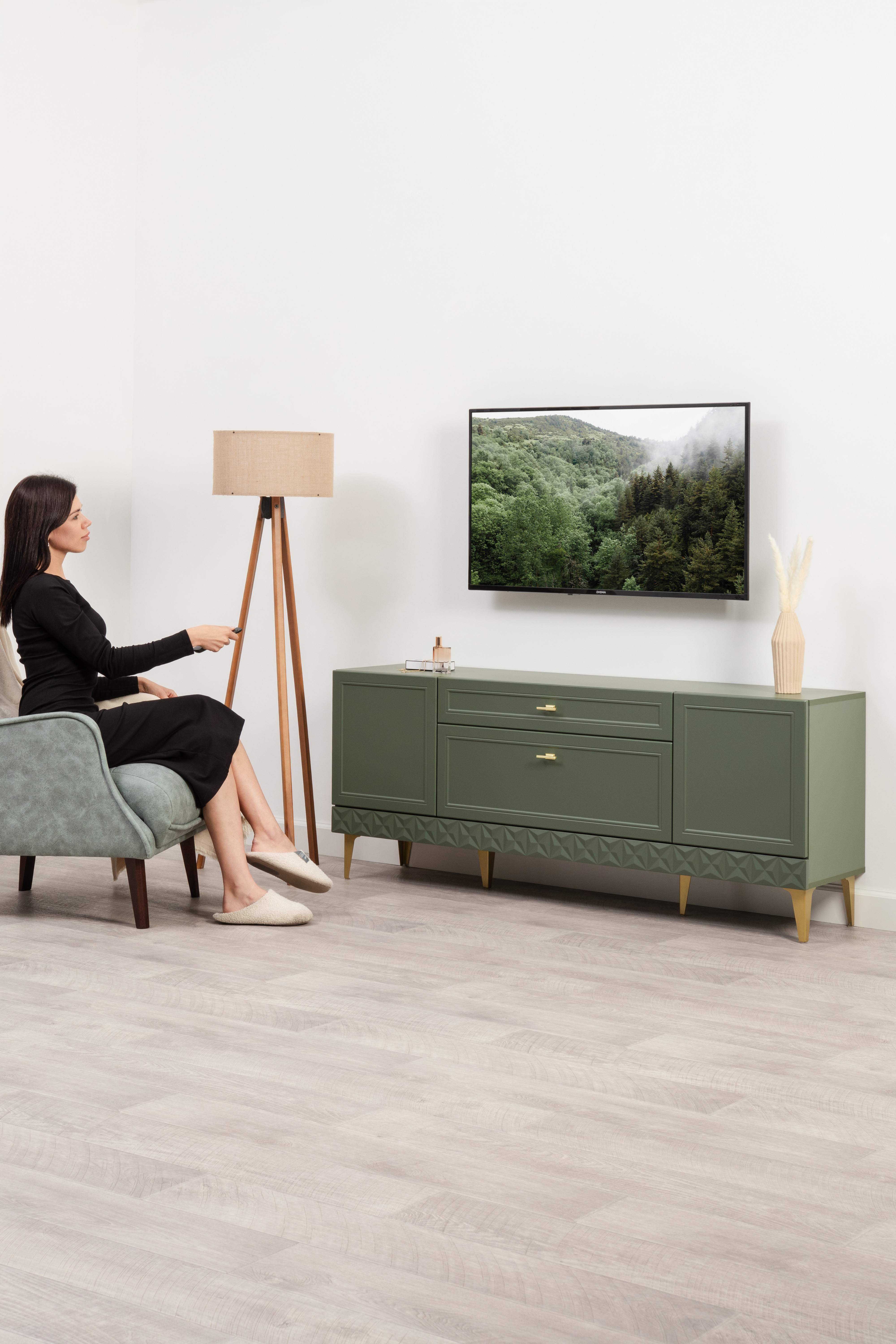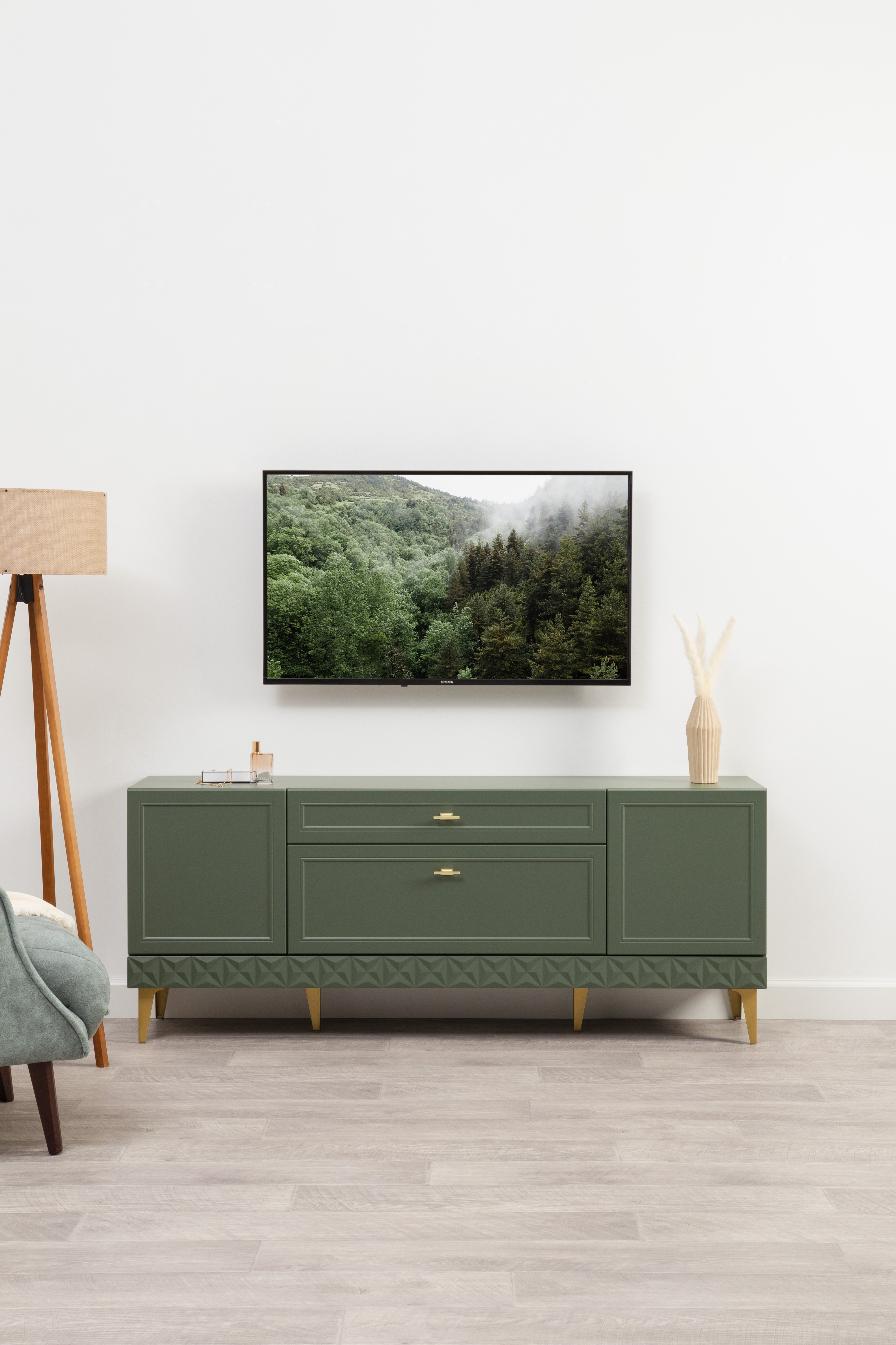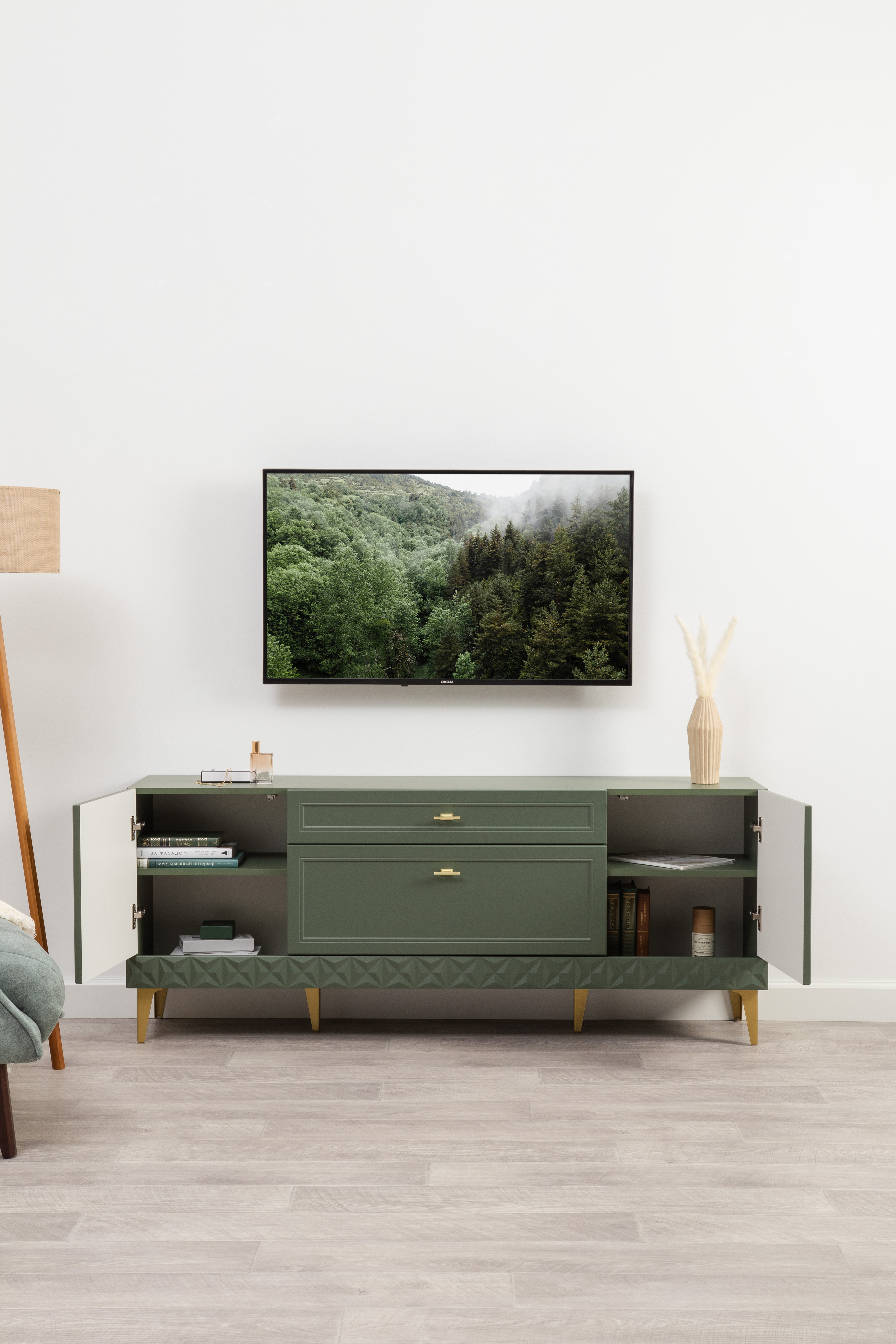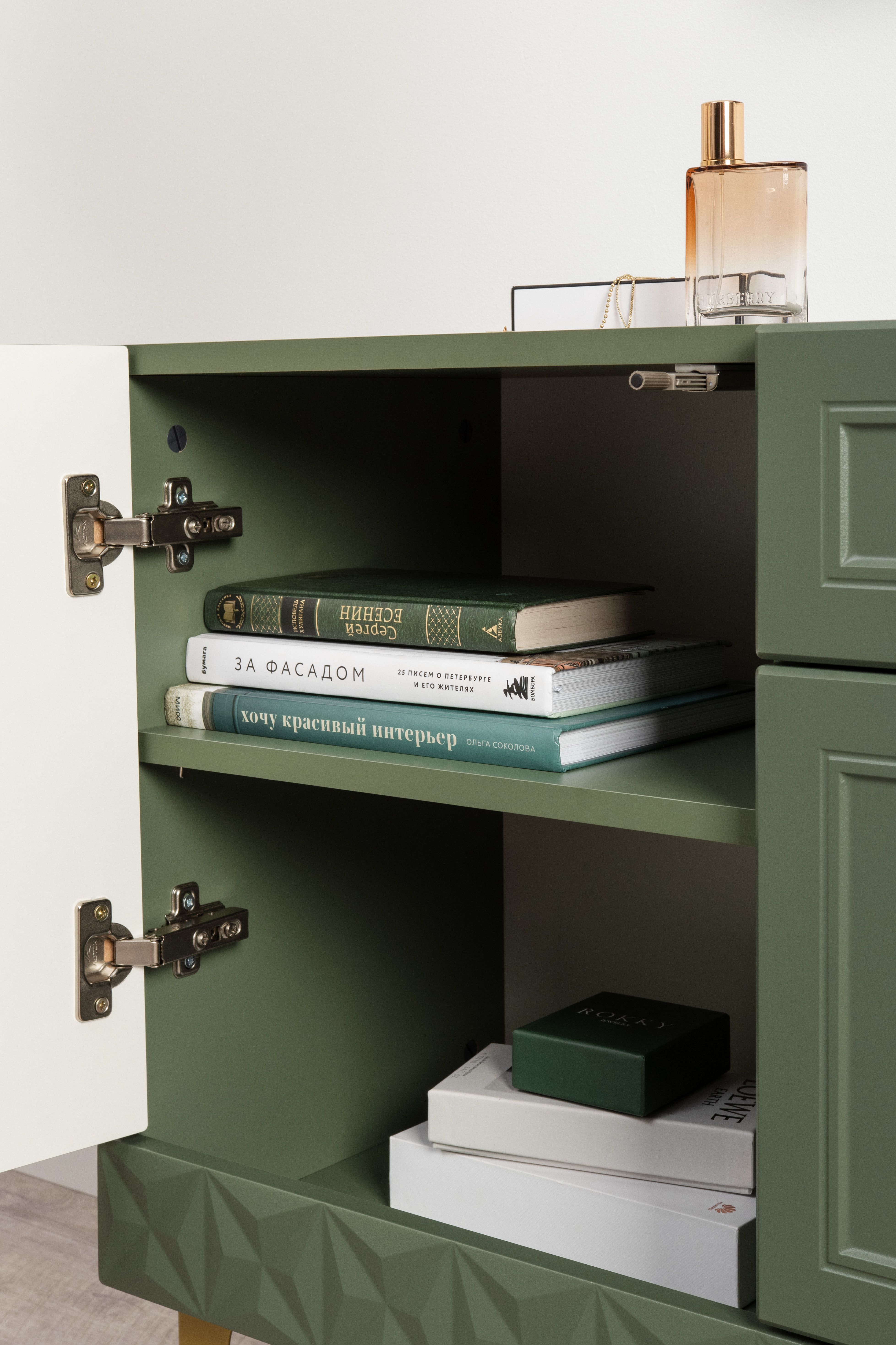 Комод Марион 16.249 дымчатый зеленый K521, олива шагрень AG 1050 ПВХ, белый PE шагрень