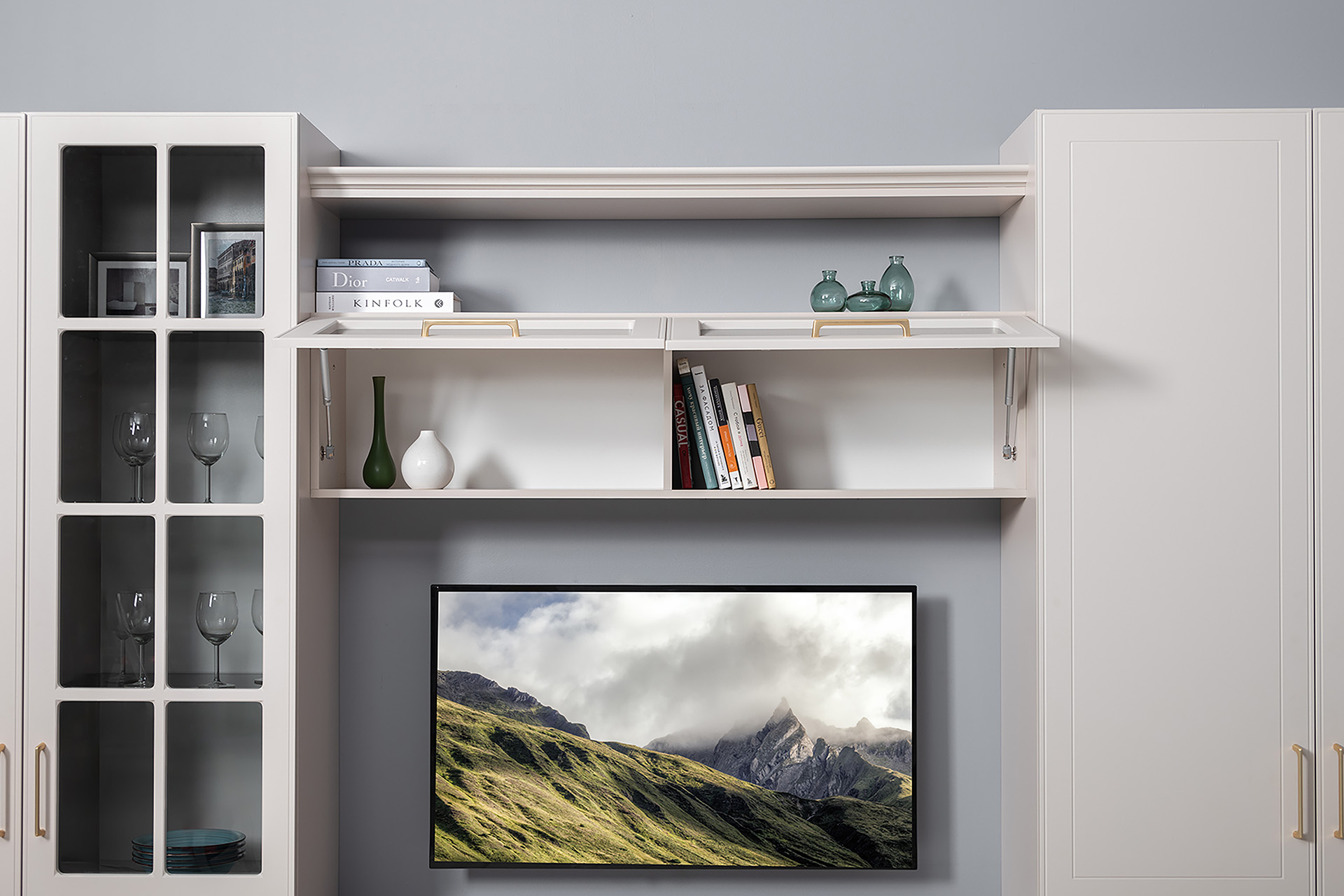 Гостиная Ричфорд композиция 1 без карнизов, кашемир 5981 BS, моно керамика D166-2 ПВХ, белый PE шагрень (собирается на любую сторону)