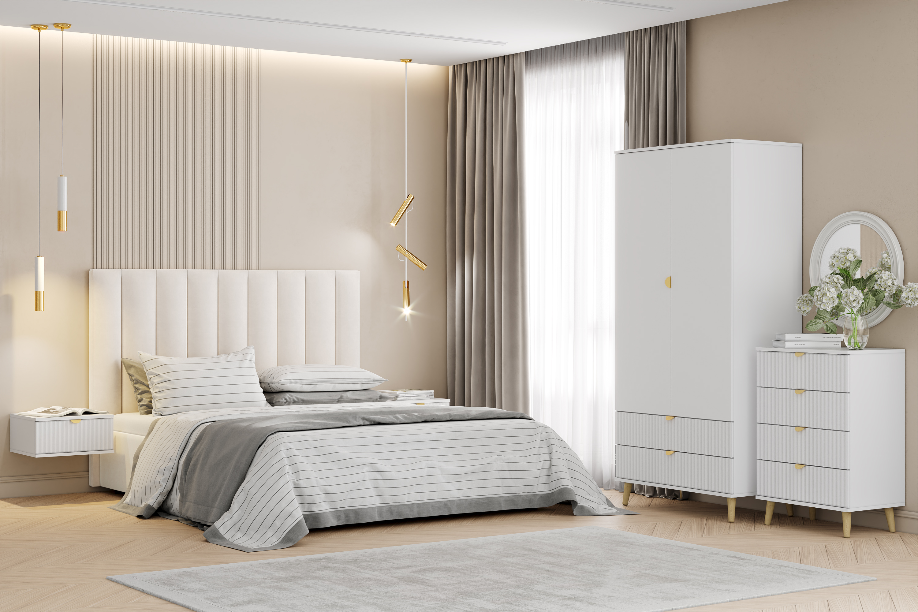 Комод оснащен четырьмя выдвижными ящиками, которые открываются плавно и бесшумно благодаря шариковым направляющим, а высокие опоры облегчают процесс уборки.