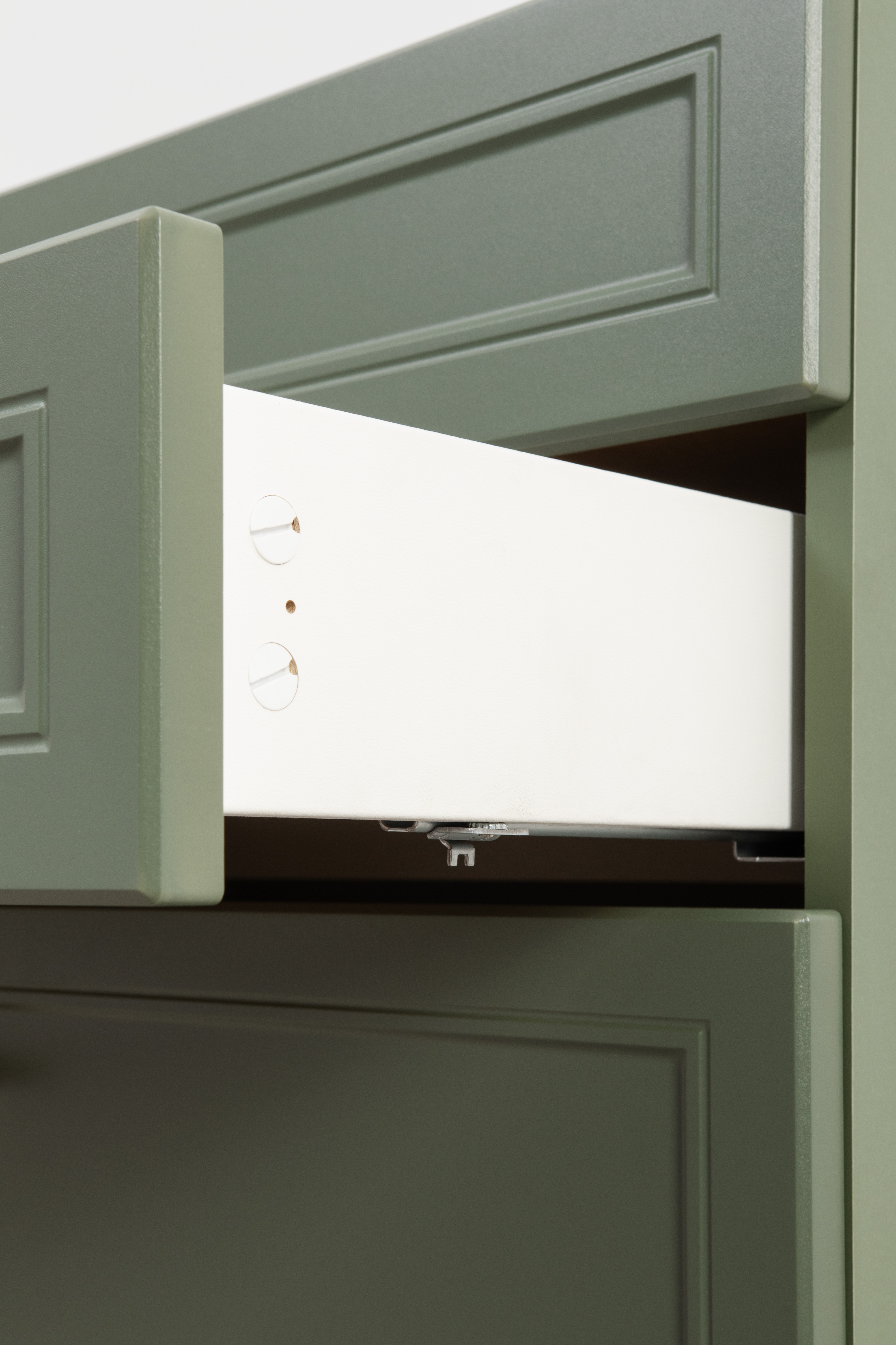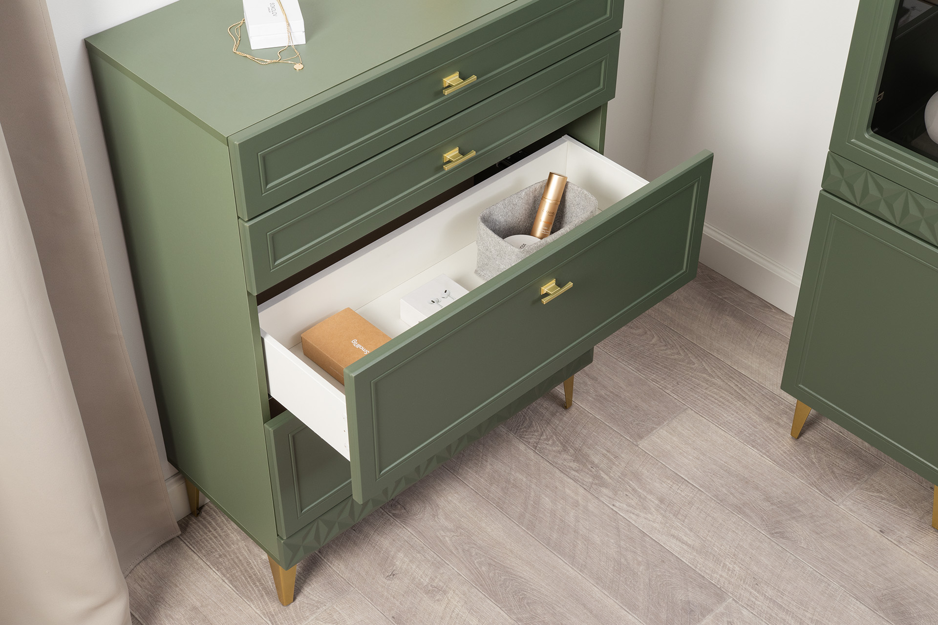 Изящные линии, глубокая фрезеровка фасадов из МДФ и благородные оттенки. Утончённая «Слоновая кость» и изысканная «Олива Шагрень» с глубоким зелёным тоном — создают атмосферу уюта, тепла и благородства. Металлические ручки и опоры золотого цвета придают мебели утончённый блеск, а петли и направляющие с доводчиками обеспечивают плавное и бесшумное закрытие фасадов.