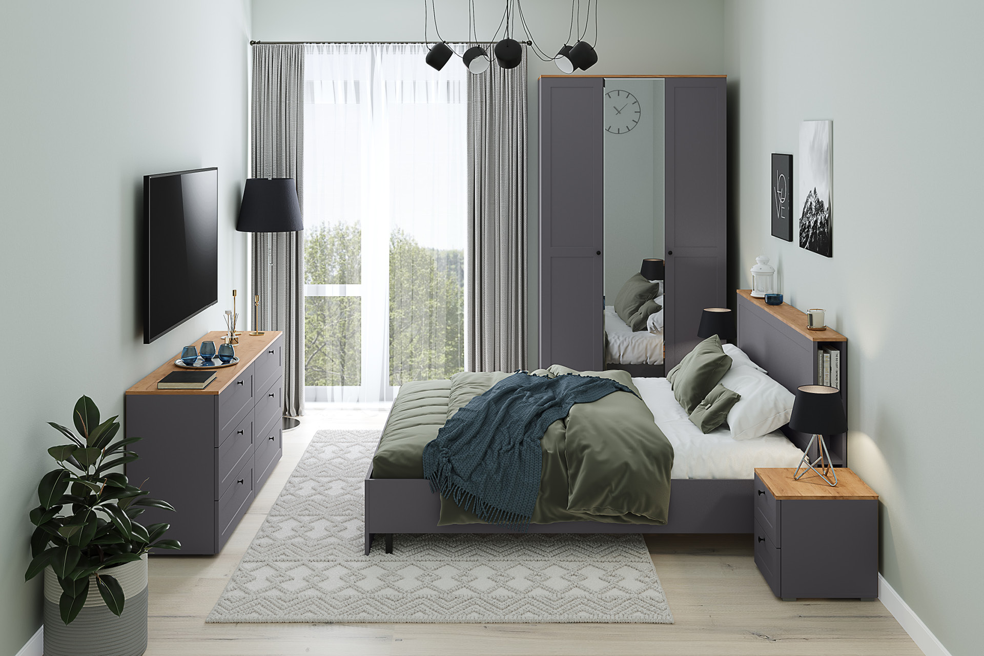 В изголовье кровати предусмотрены вместительные ниши. Шкафная группа полноценной глубины позволяет эффективно организовать систему хранения.