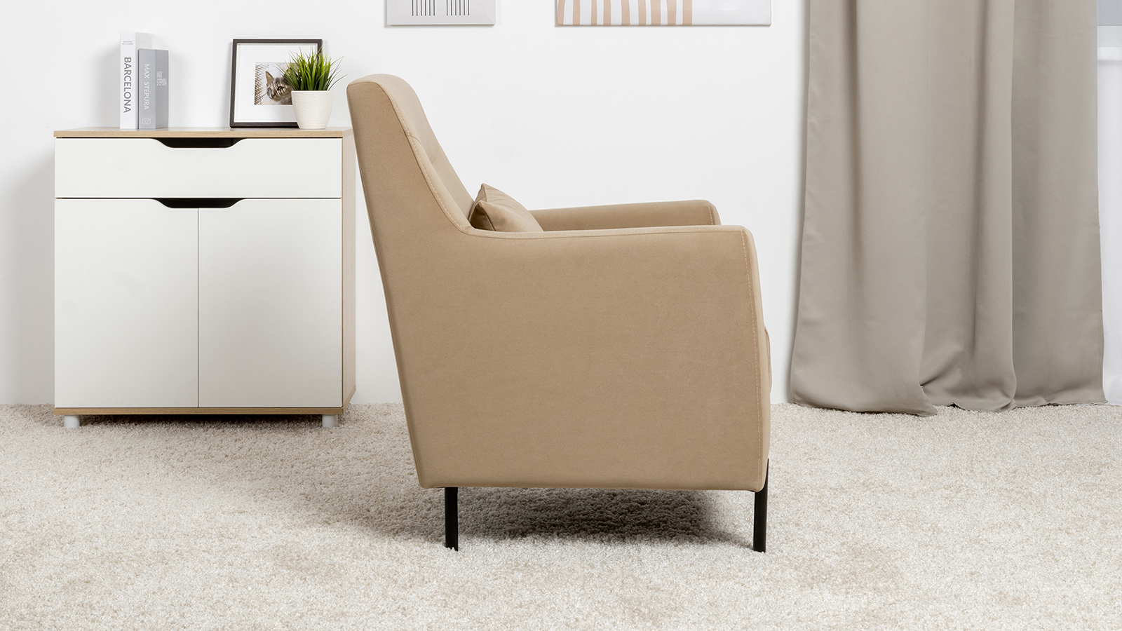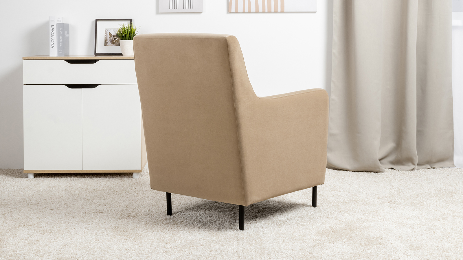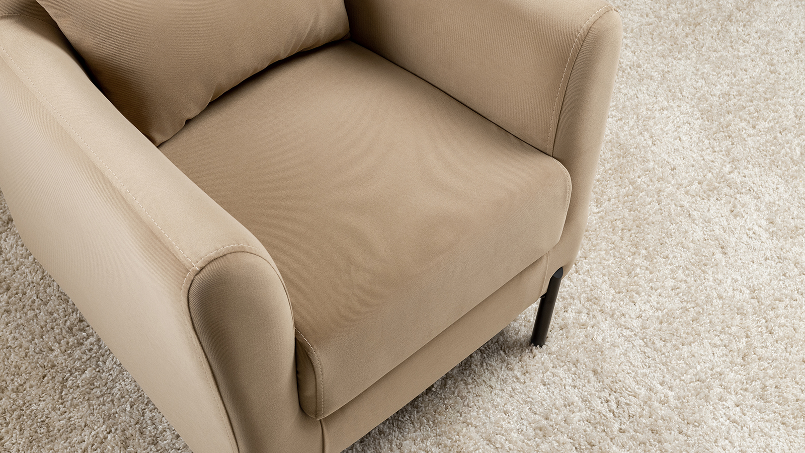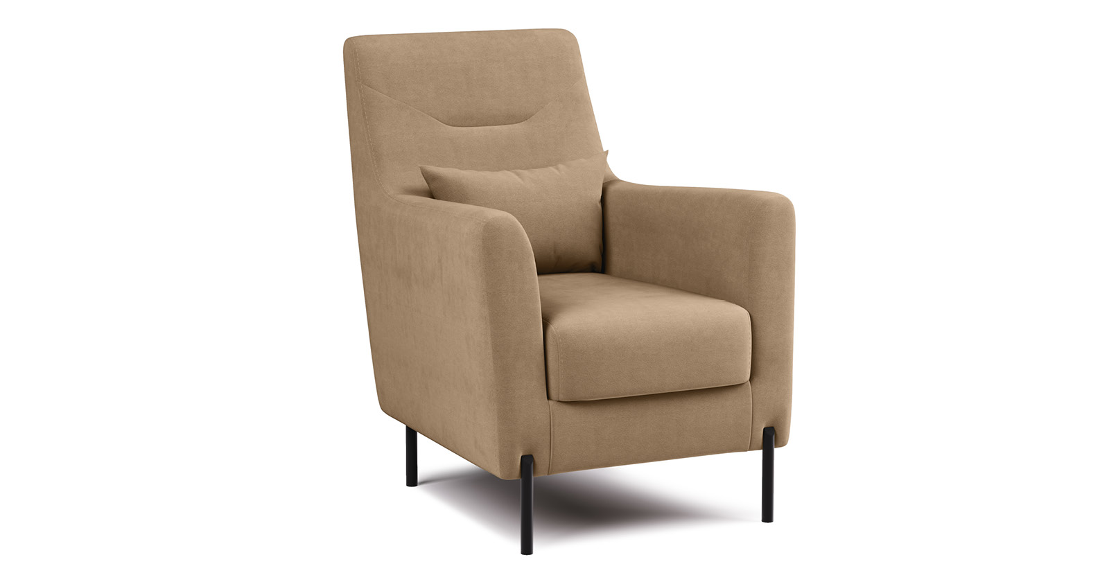 Декоративная утяжка на спинке кресла, декоративная подушка в цвете кресла, металлические опоры переходят в декоративный элемент подлокотника