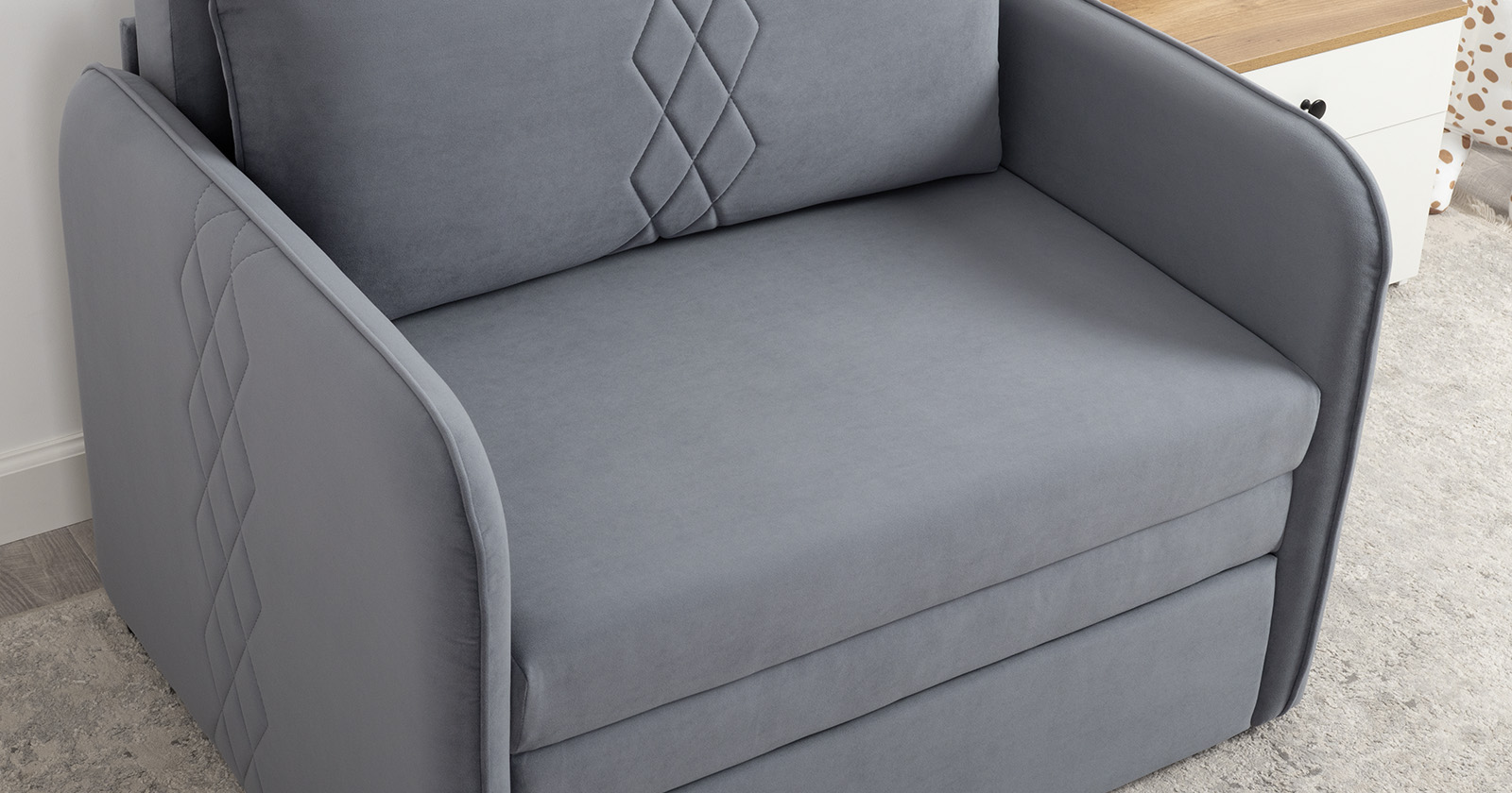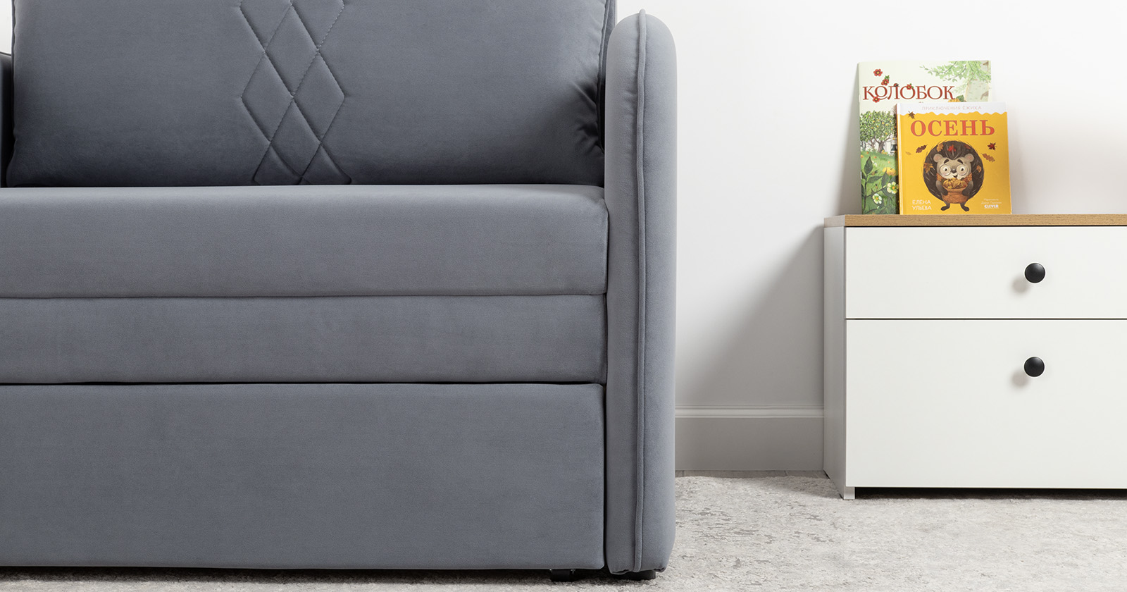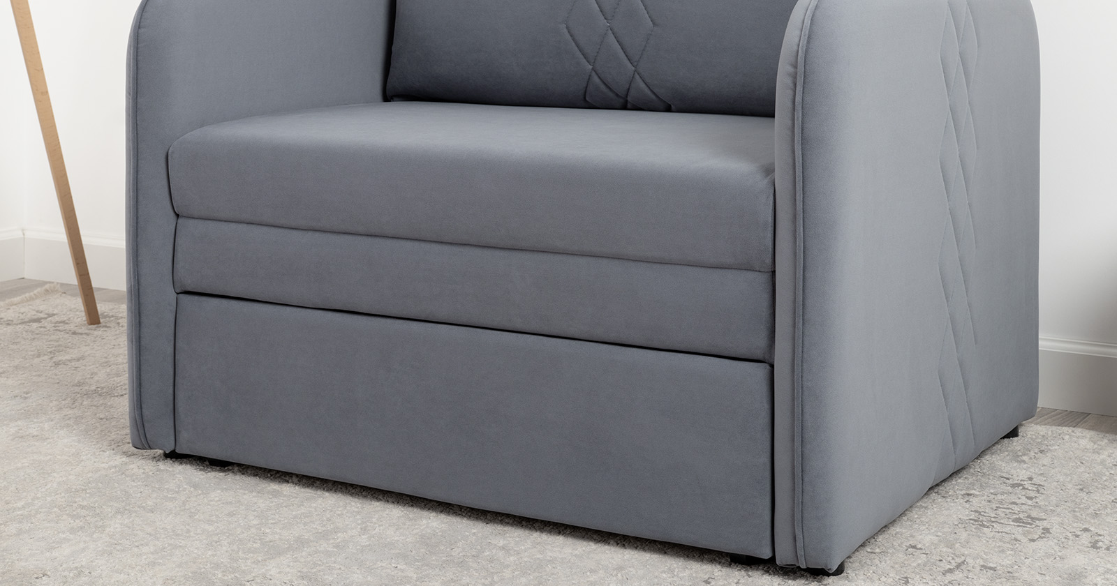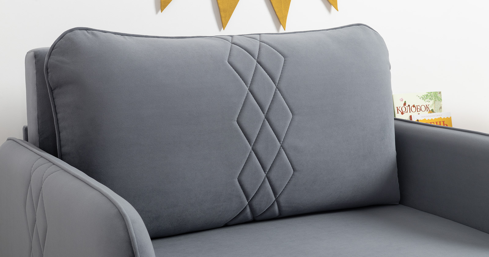 Стильный компактный диван для детской и гостиной. При своих скромных размерах он трансформируется в полноценное спальное место для детей и подростков. Лаконичный дизайн в виде декоративной стежки подчеркивает фактуру велюра, а небольшие размеры позволят разместить его в любом пространстве.