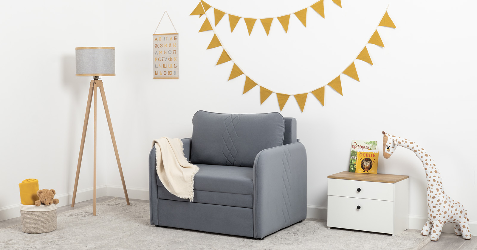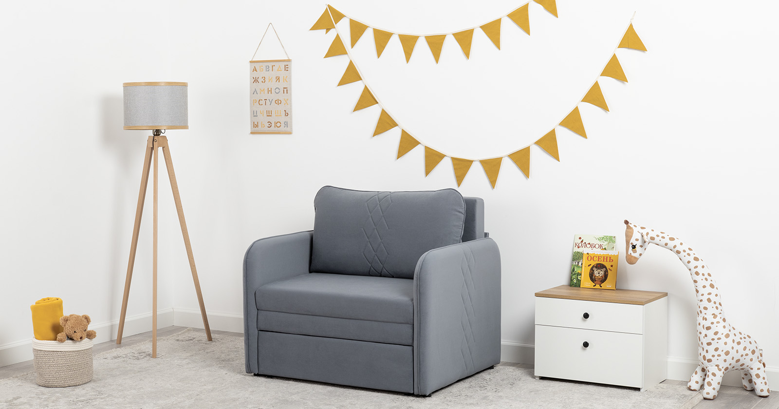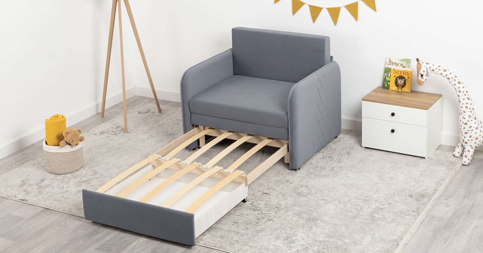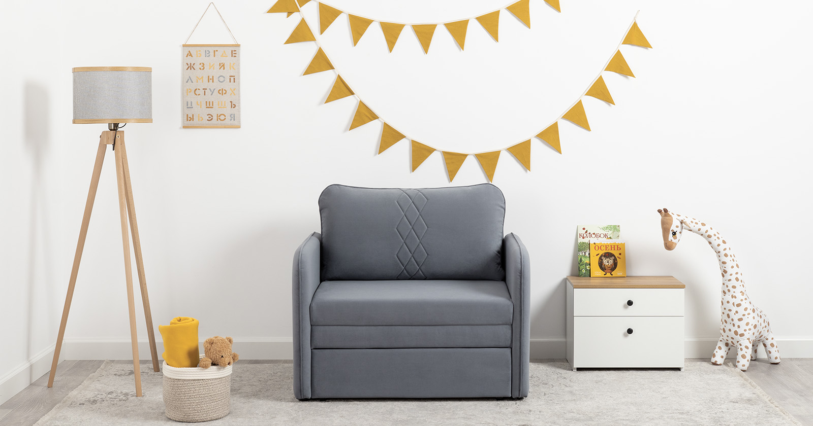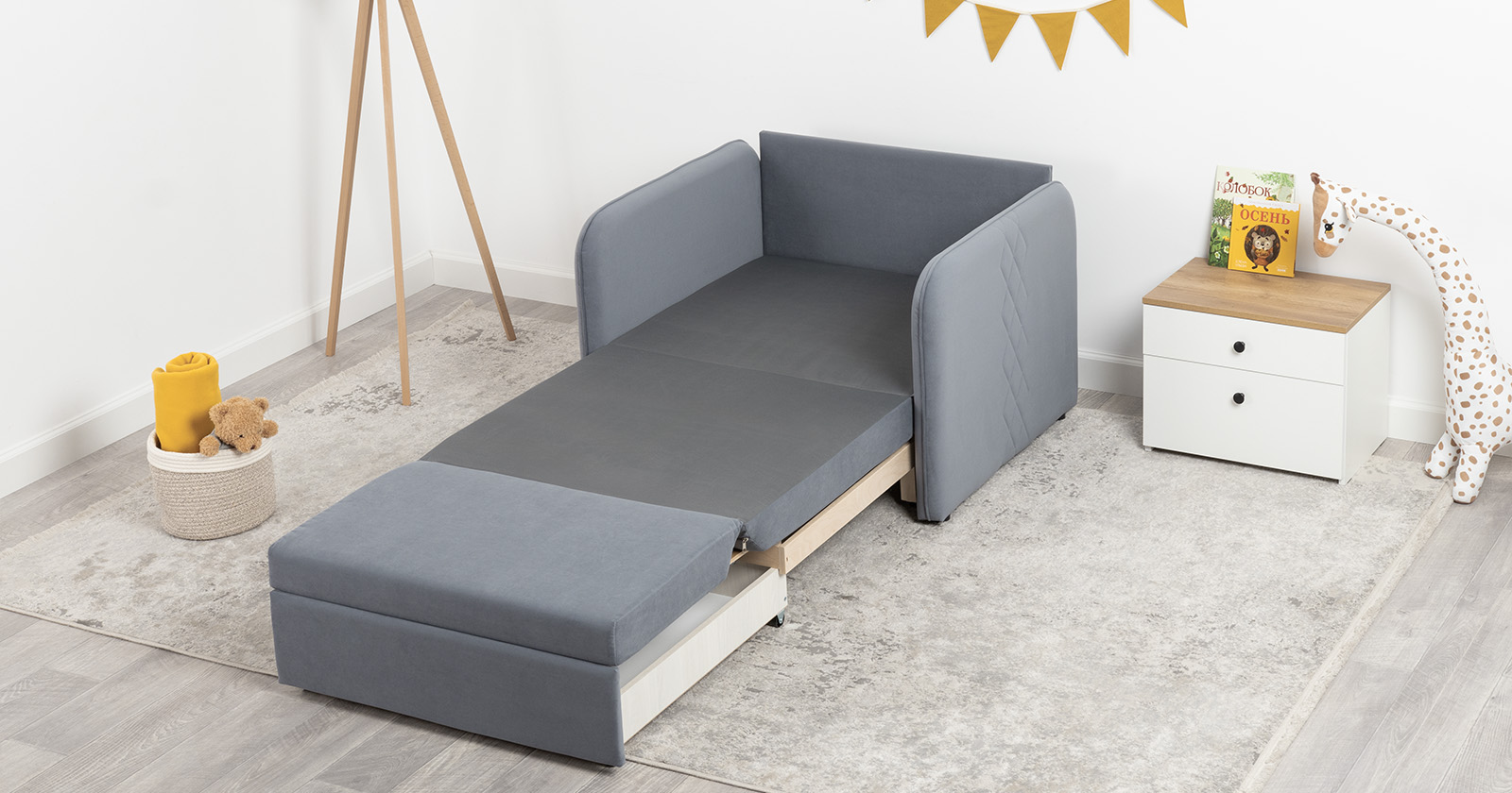 Стильный компактный диван для детской и гостиной. При своих скромных размерах он трансформируется в полноценное спальное место для детей и подростков. Лаконичный дизайн в виде декоративной стежки подчеркивает фактуру велюра, а небольшие размеры позволят разместить его в любом пространстве.