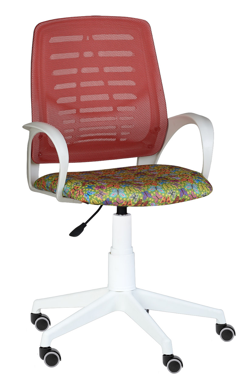 Кресло на колесах Ирис белый каркас, обивка сидушка - ткань саржа бабочки, спинка красный, подлокотники пластик, крестовина пластик, без качания