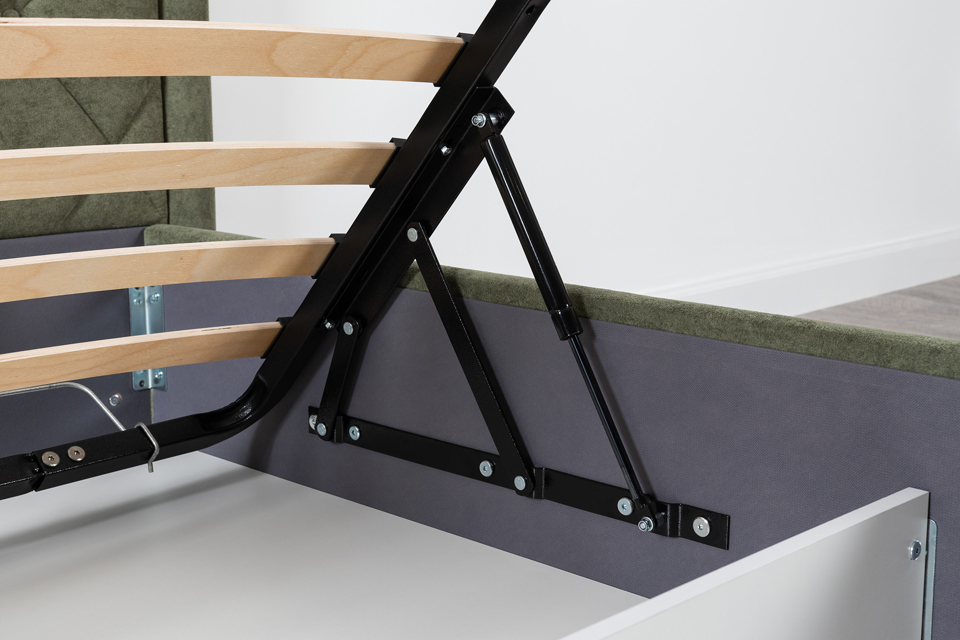 Основание кровати укомплектовано матрасодержателями. Жесткое кроватное дно из ЛДСП 16 мм на опорах 25 мм.