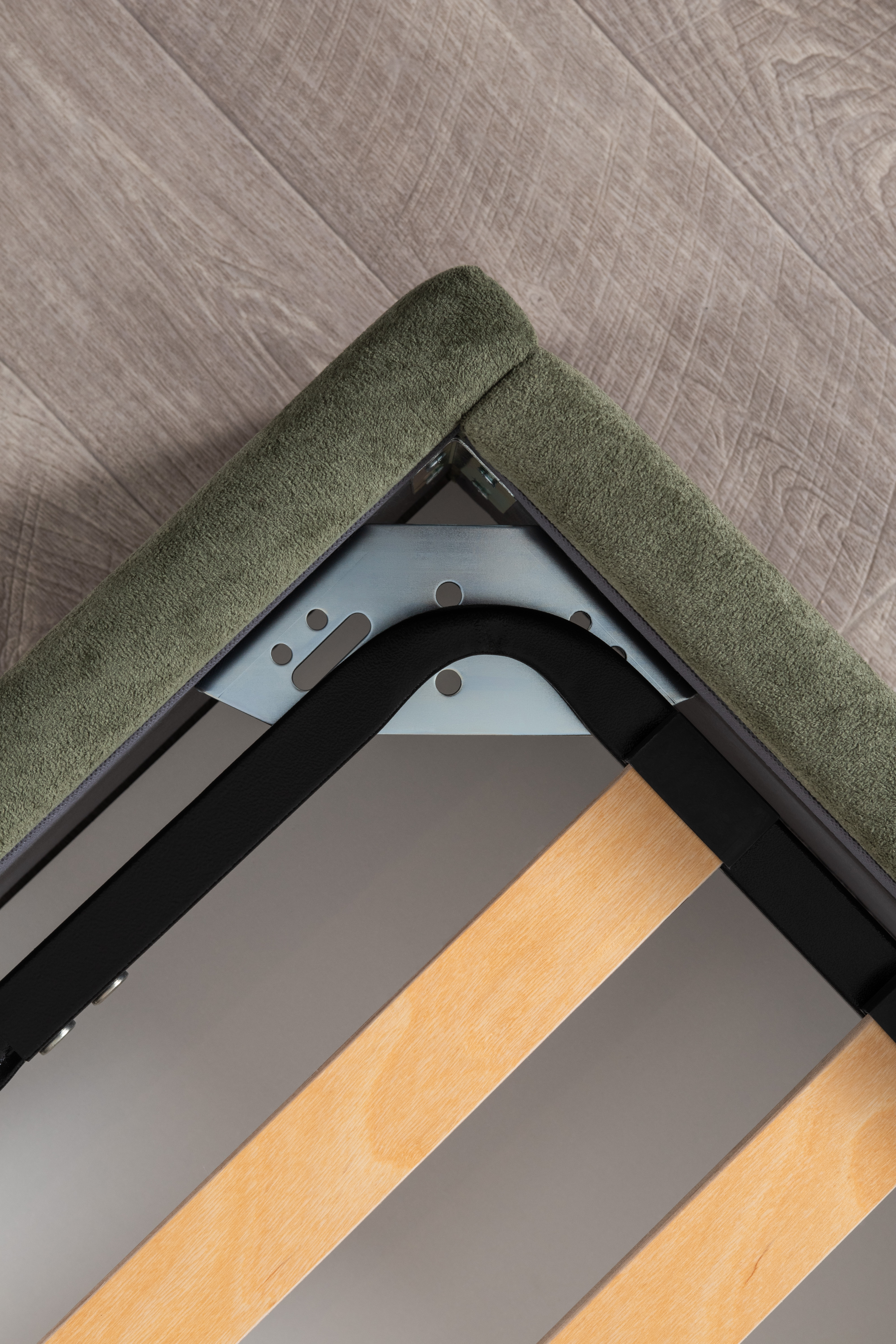 Основание кровати укомплектовано матрасодержателями. Жесткое кроватное дно из ЛДСП 16 мм на опорах 25 мм.