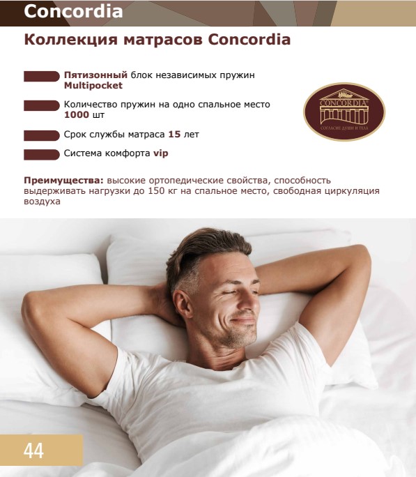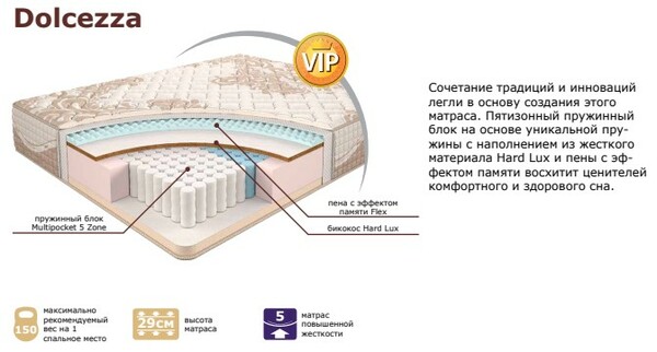 Сочетание традиций и инноваций легли в основу создания этого матраса. Пятизонный пружинный блок на основе уникальной пружины с наполнением из жесткого Hard Lux и пены с эффектом памяти восхитит ценителей комфортного и здорового сна. Матрас объединяет в себе все лучшие свойства материалов, специально созданных для достижения максимального комфорта и уюта. Надежная внутренняя конструкция матраса обеспечивает отличную поддержку позвоночника. А высокоэластичная суперпена с эффектом памяти создает непревзойденное ощущение невесомости и легкости. Особенную прохладу, свежесть и мягкость придает матрасу Concordia Celenzio чехол, выполненный из трикотажа с волокнами вискозы и пропитанный ионами серебра. Погружаясь в сказочный волшебный сон, Вы будете чувствовать лишь нежность, легкость и беззаботность.