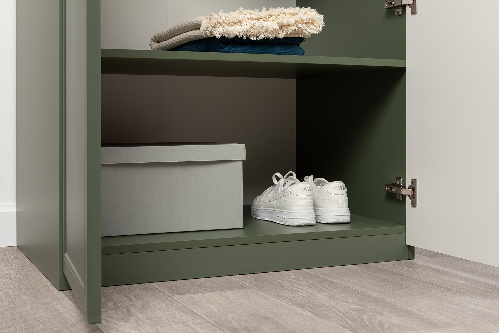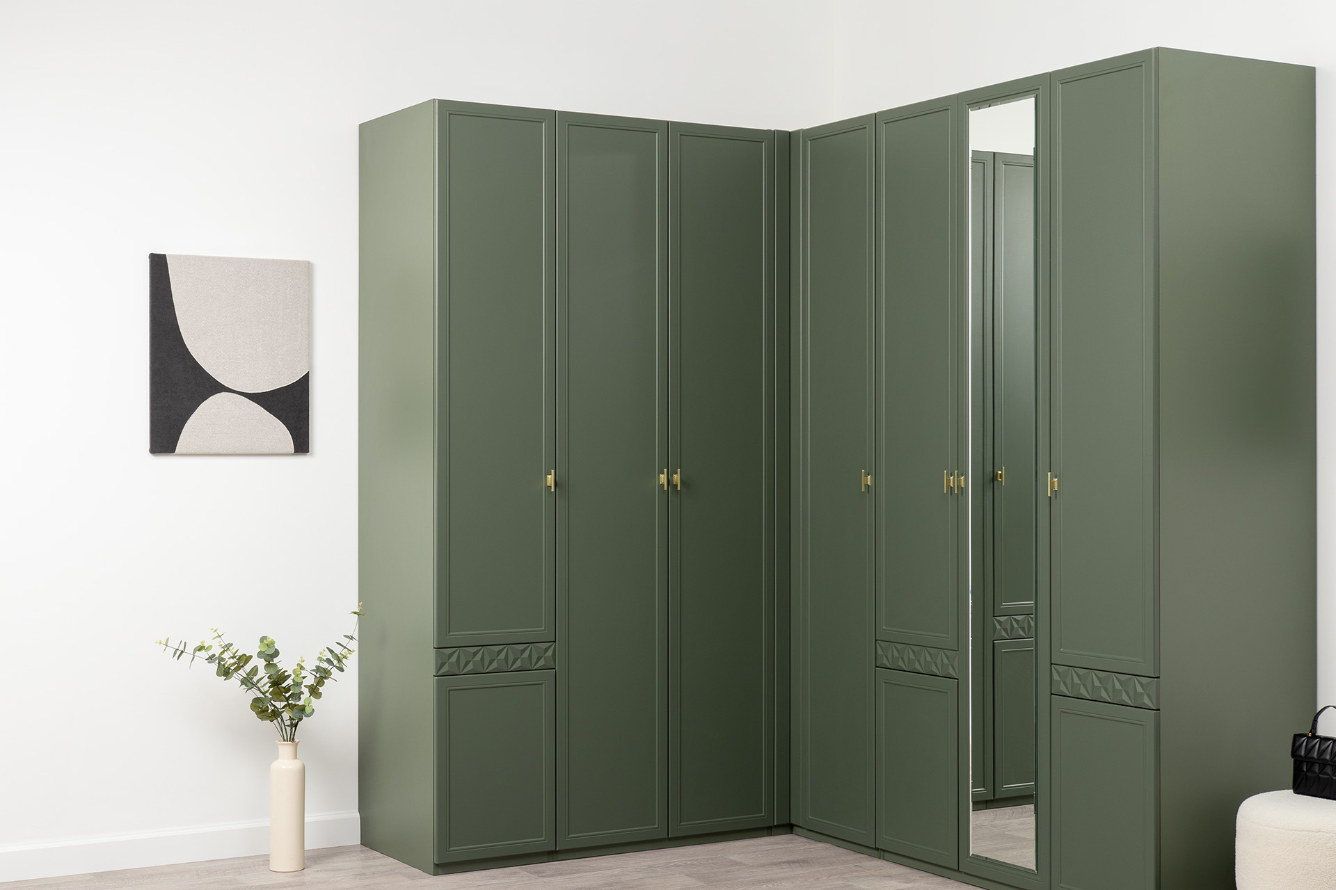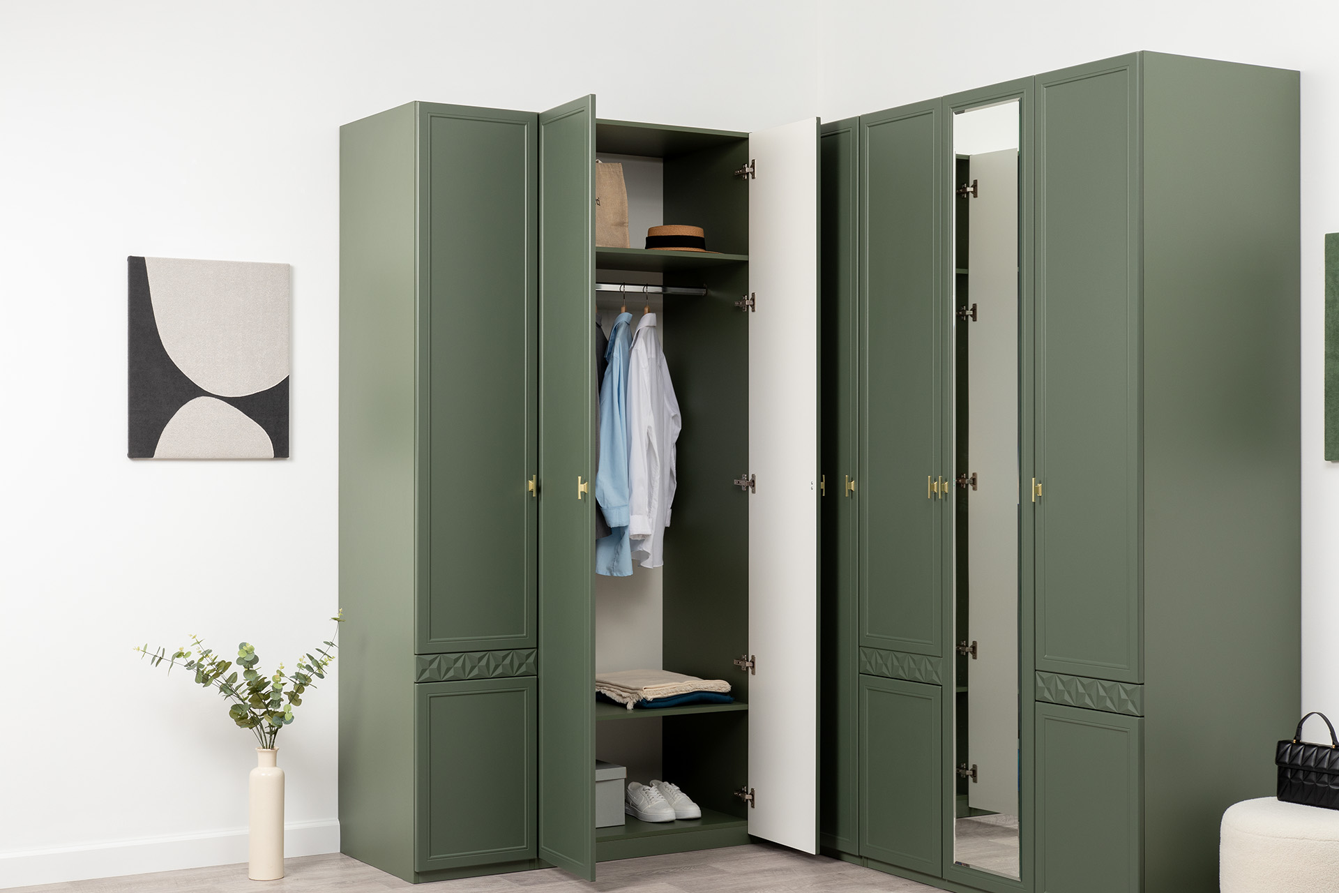 Изящные линии, глубокая фрезеровка фасадов из МДФ и благородные оттенки. Утончённая «Слоновая кость» и изысканная «Олива Шагрень» с глубоким зелёным тоном — создают атмосферу уюта, тепла и благородства. Металлические ручки и опоры золотого цвета придают мебели утончённый блеск, а петли и направляющие с доводчиками обеспечивают плавное и бесшумное закрытие фасадов.