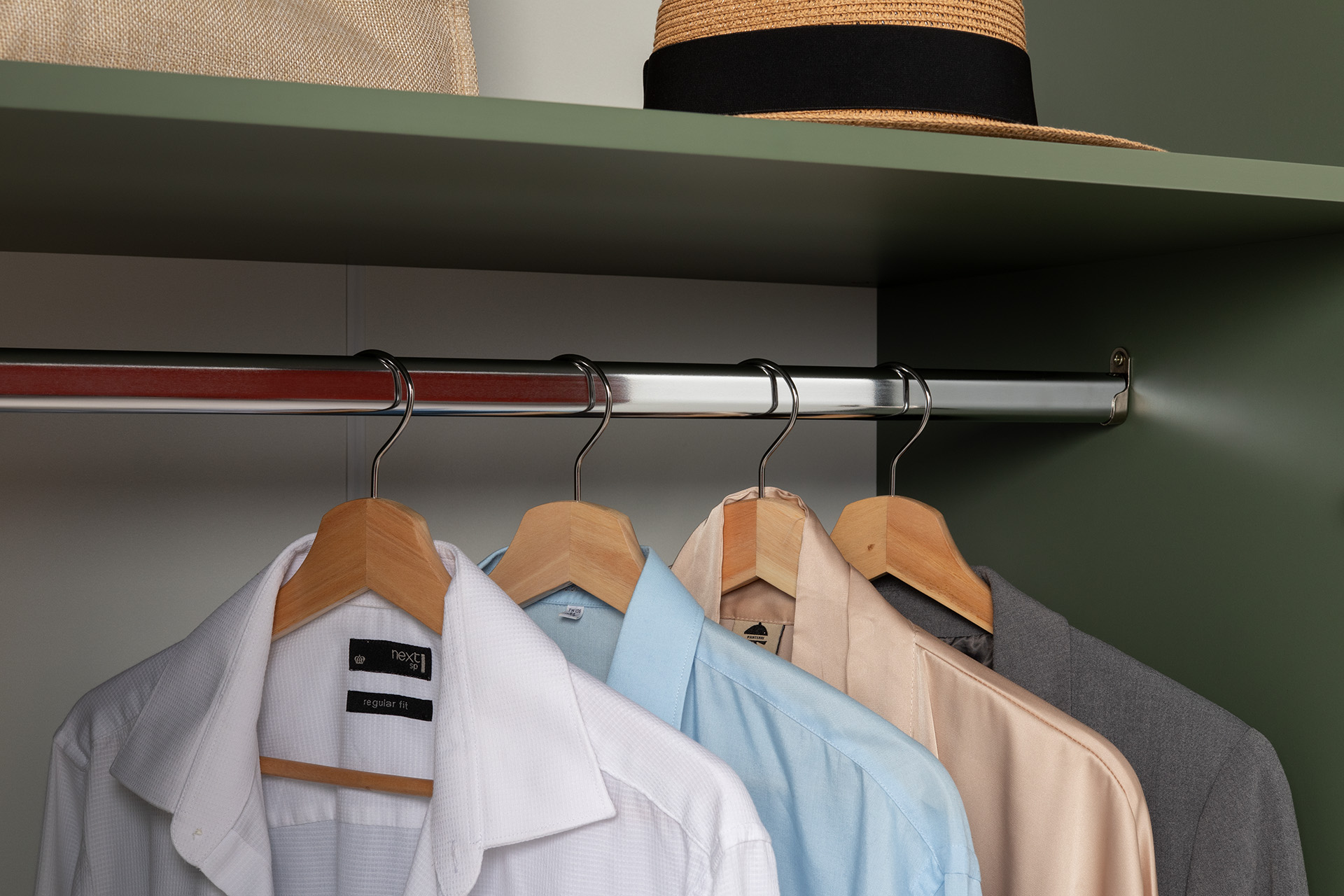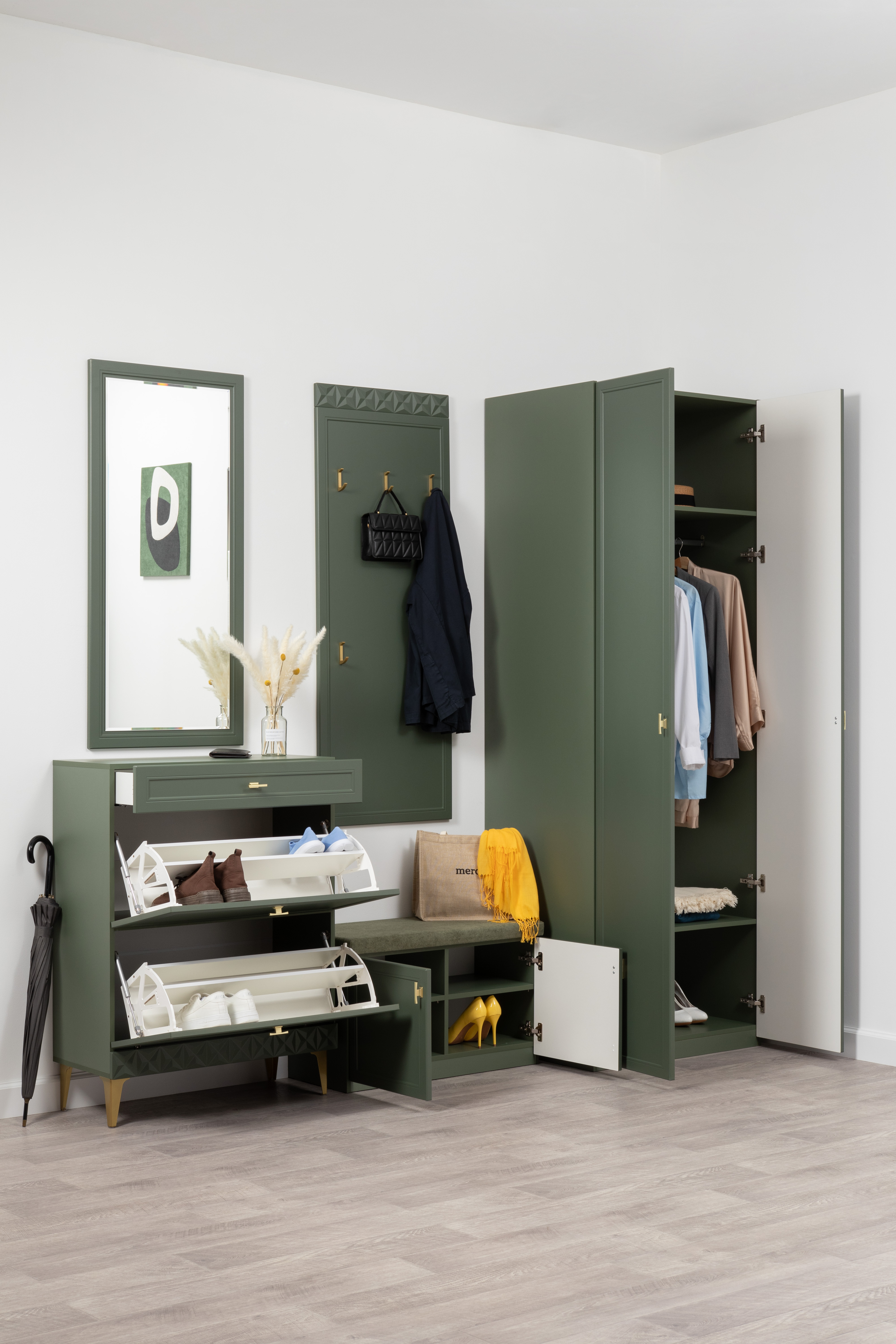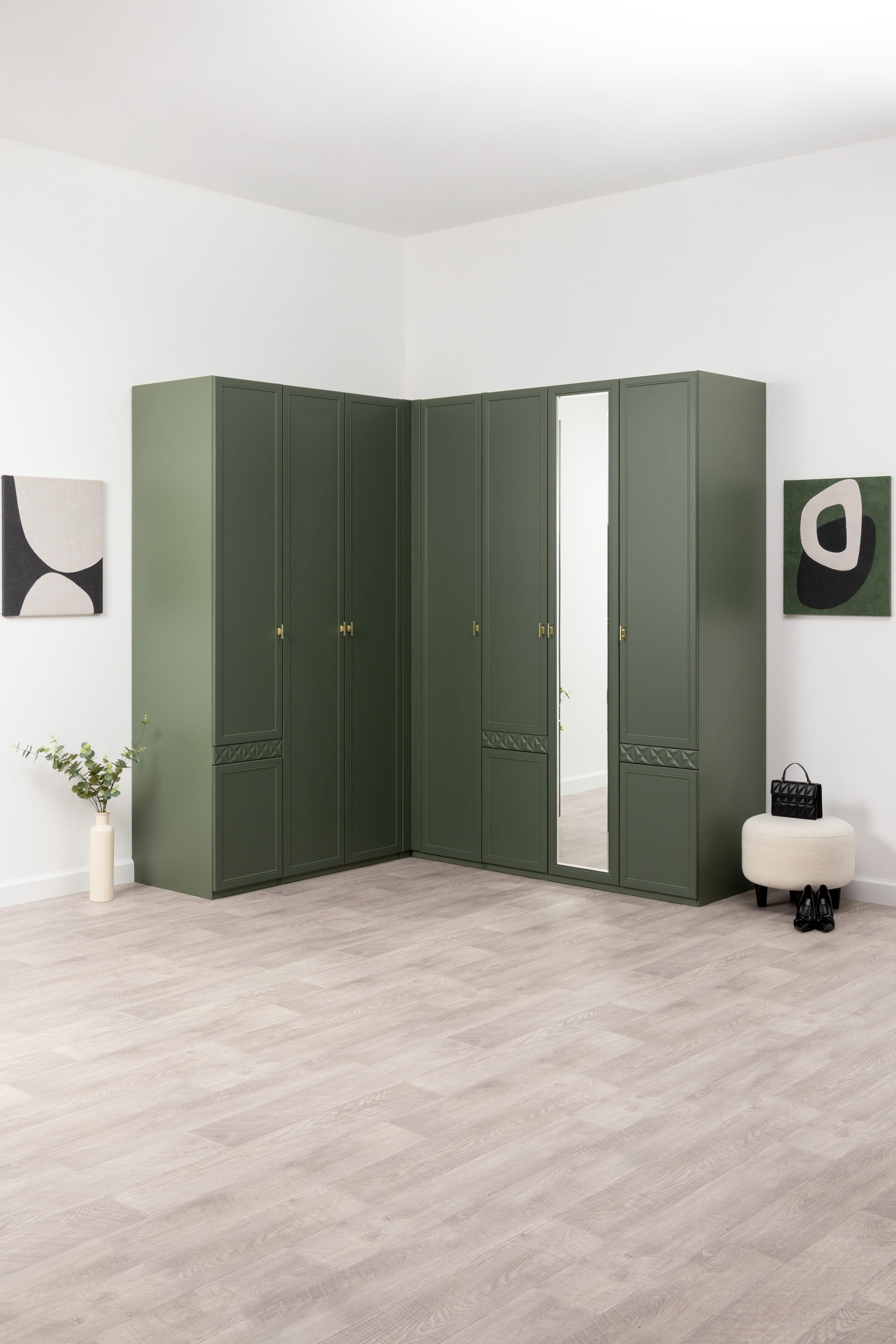 Изящные линии, глубокая фрезеровка фасадов из МДФ и благородные оттенки. Утончённая «Слоновая кость» и изысканная «Олива Шагрень» с глубоким зелёным тоном — создают атмосферу уюта, тепла и благородства. Металлические ручки и опоры золотого цвета придают мебели утончённый блеск, а петли и направляющие с доводчиками обеспечивают плавное и бесшумное закрытие фасадов.