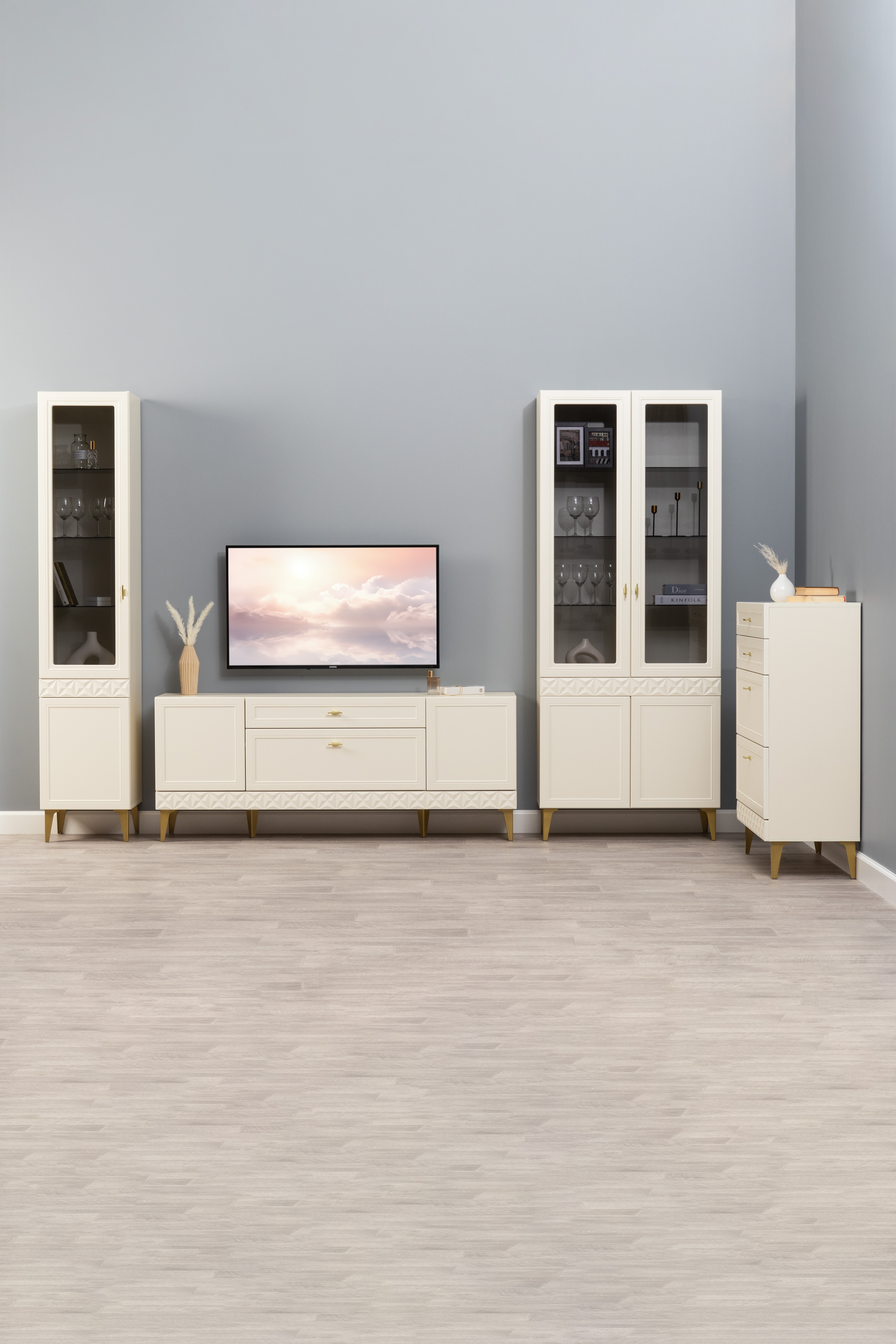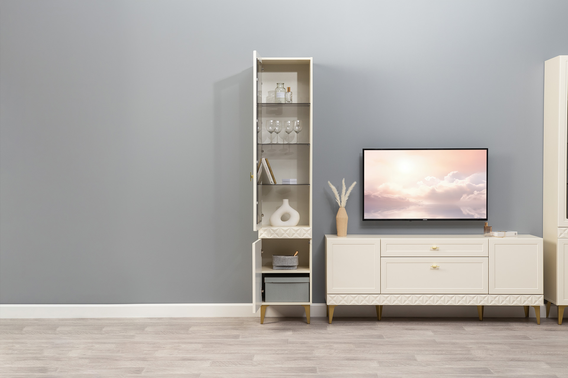 В коллекции представлены три типа витрин с тонированным закалённым стеклом, которые придают пространству лёгкость и свет. «Марион» — идеальное сочетание традиций и актуального дизайна в каждой детали.
