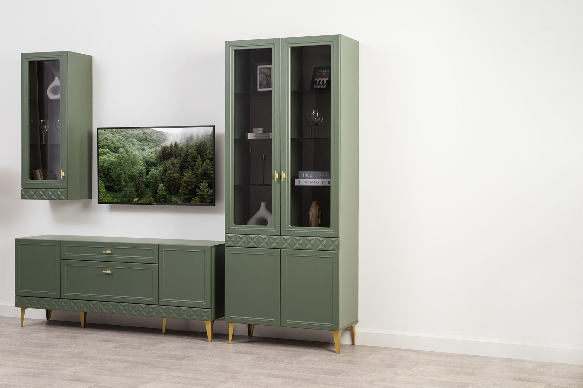 Шкаф-витрина Марион 16.397.02 дымчатый зеленый K521, олива шагрень AG 1050 ПВХ (собирается на любую сторону)
