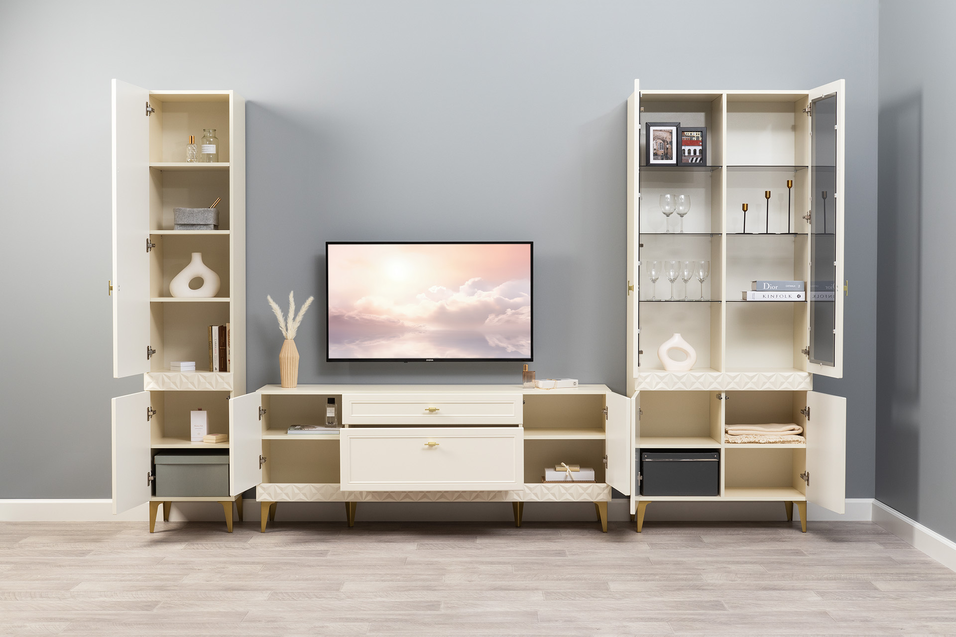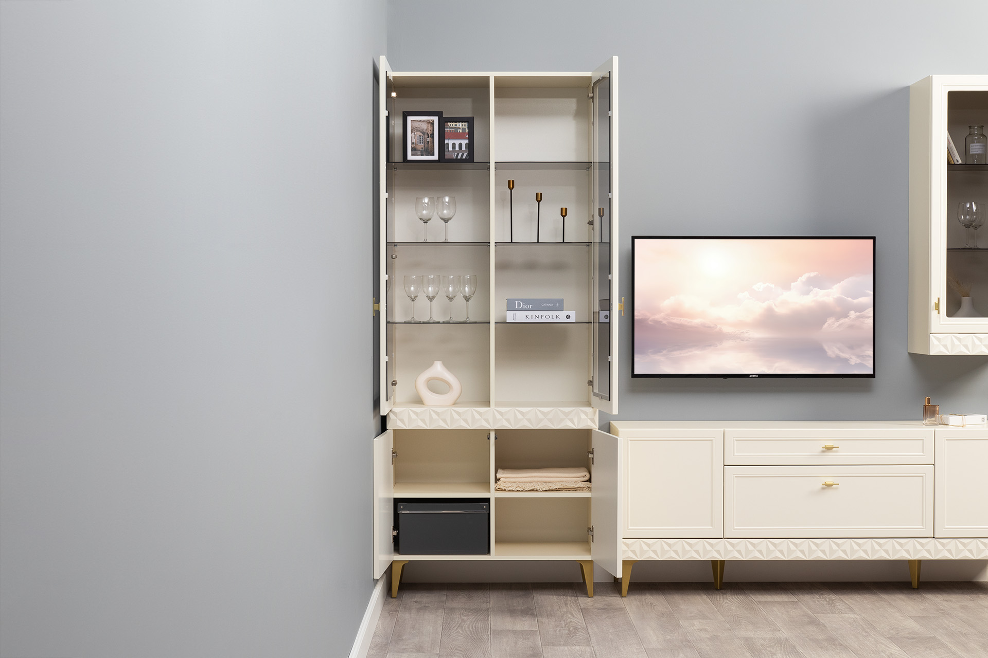Шкаф-пенал в гостиную Ливерпуль белый, ясень ваниль ПВХ