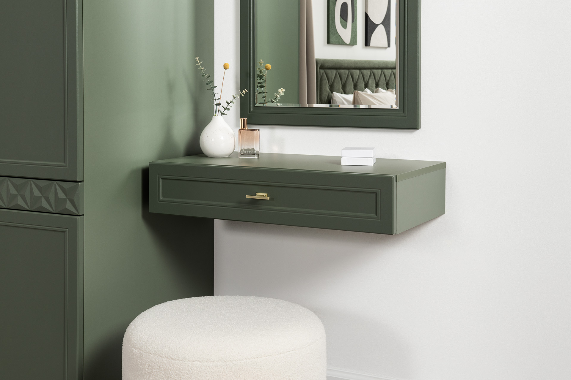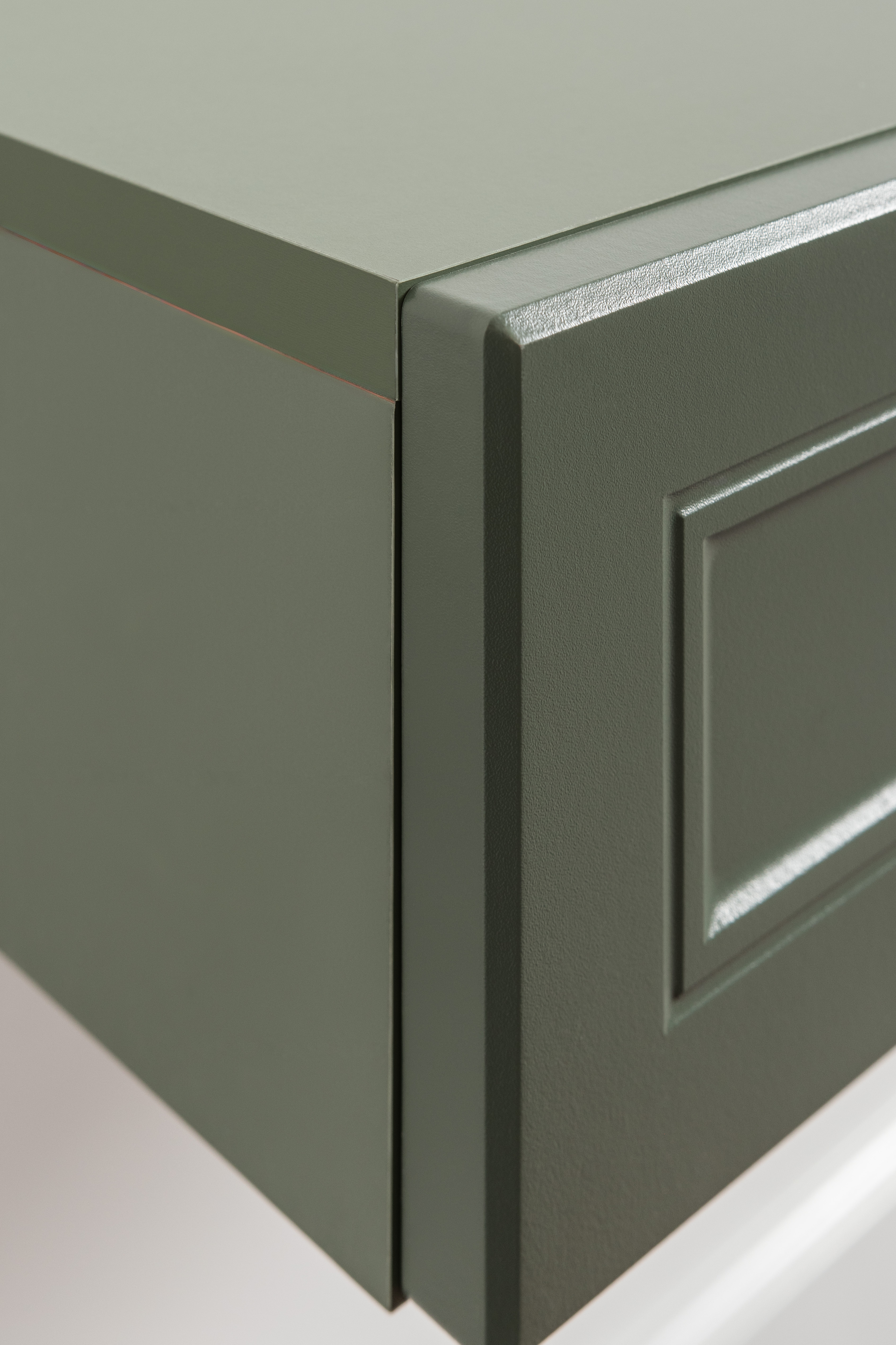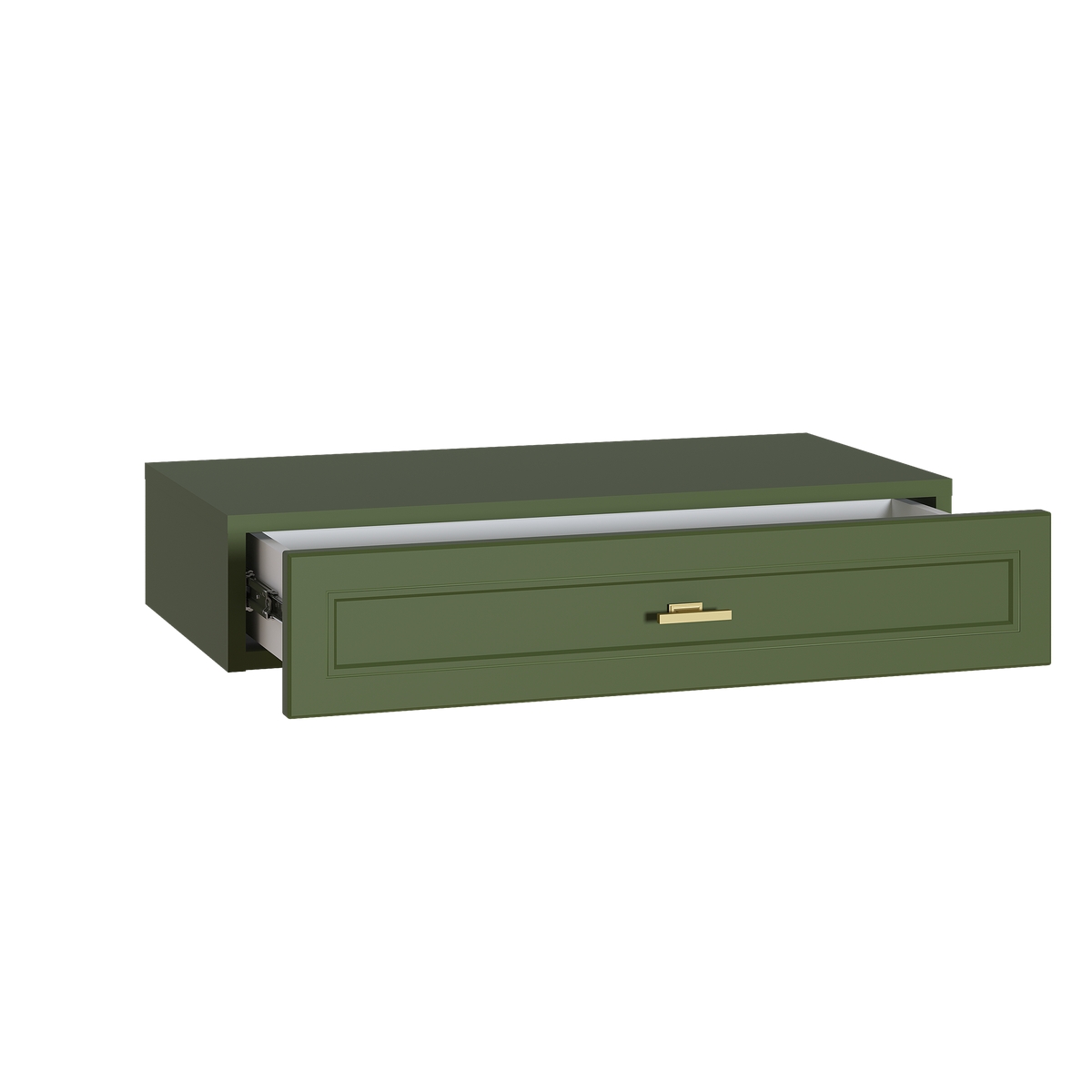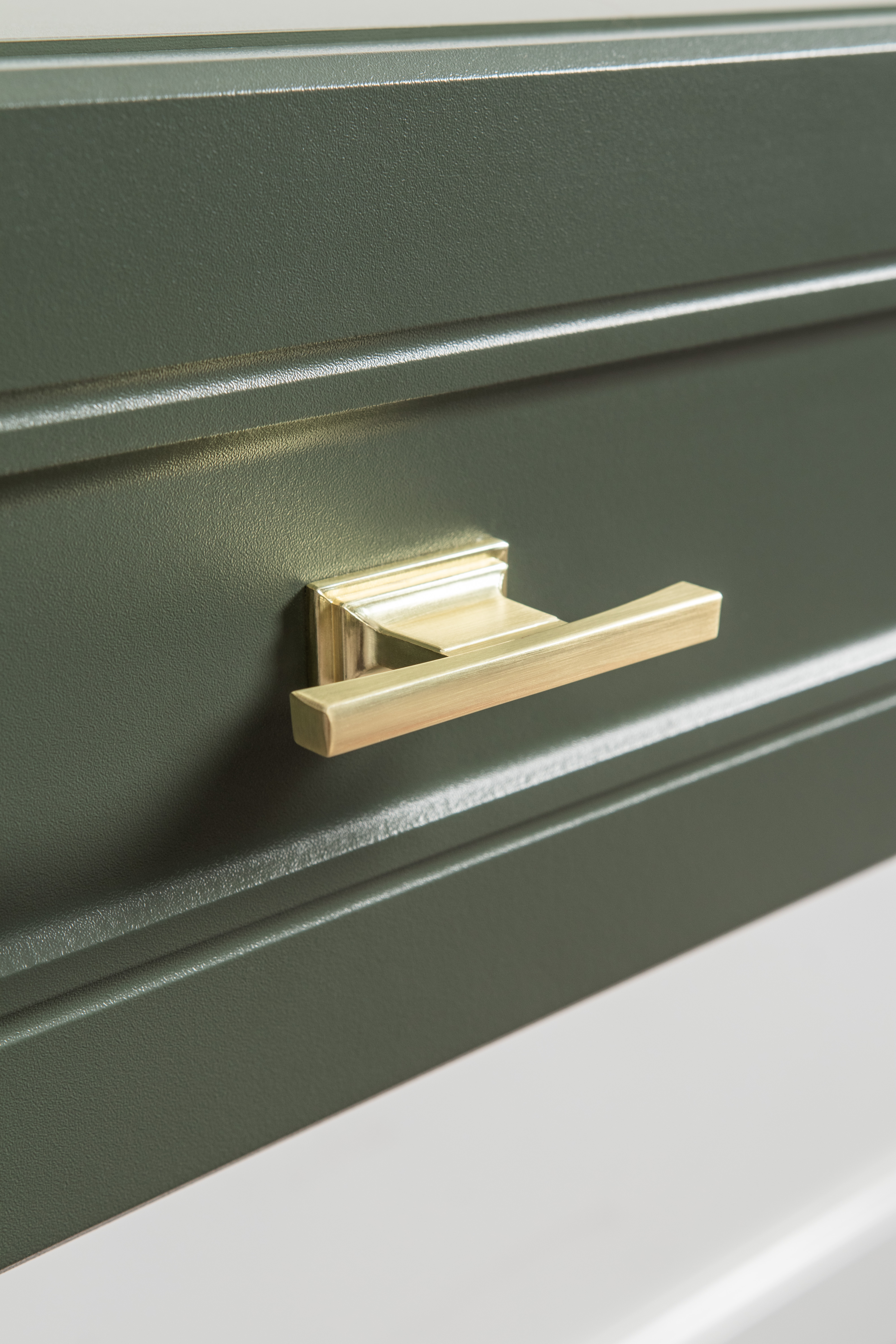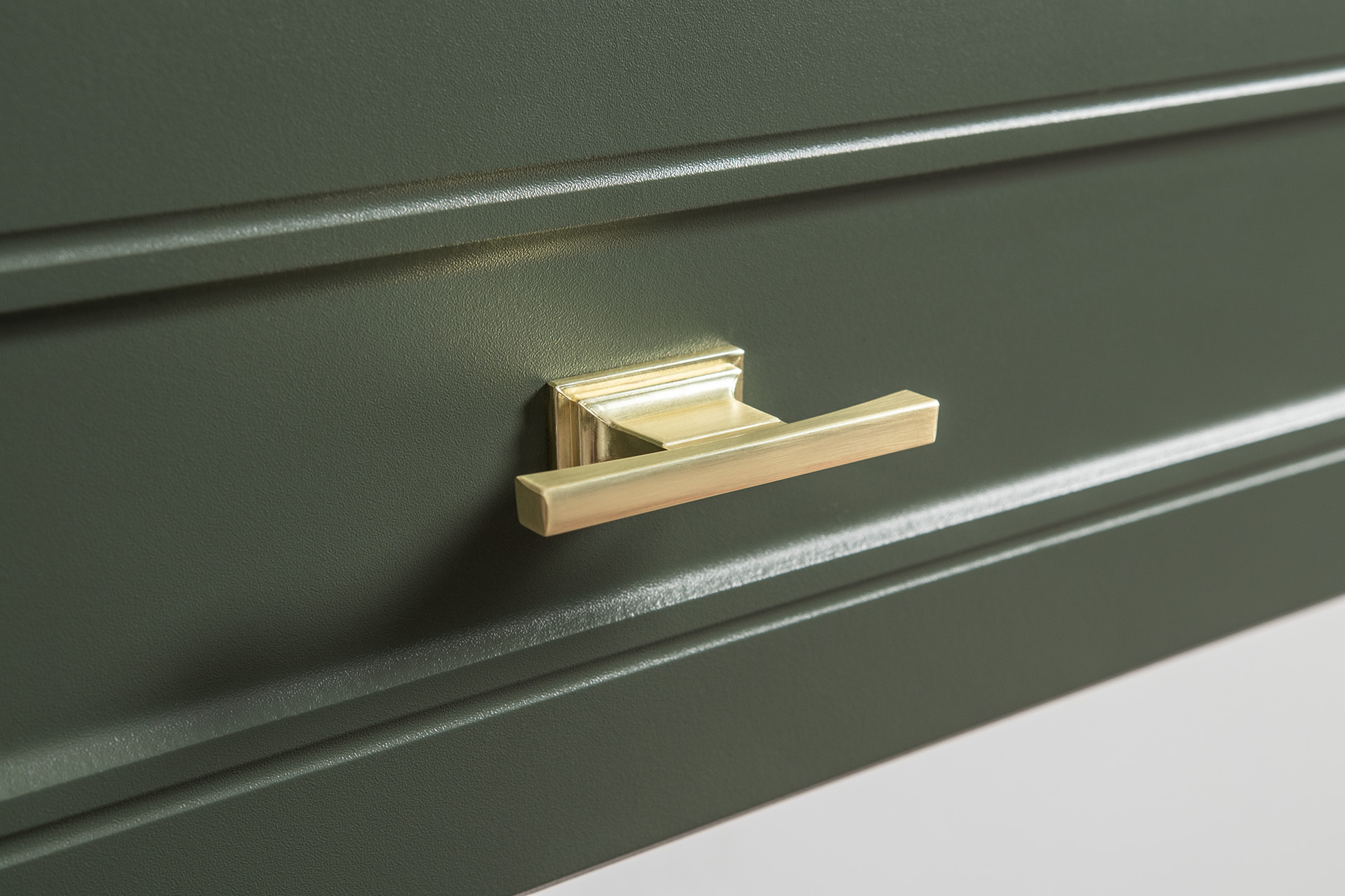 Изящные линии, глубокая фрезеровка фасадов из МДФ и благородные оттенки. Утончённая «Слоновая кость» и изысканная «Олива Шагрень» с глубоким зелёным тоном — создают атмосферу уюта, тепла и благородства. Металлические ручки и опоры золотого цвета придают мебели утончённый блеск, а петли и направляющие с доводчиками обеспечивают плавное и бесшумное закрытие фасадов.