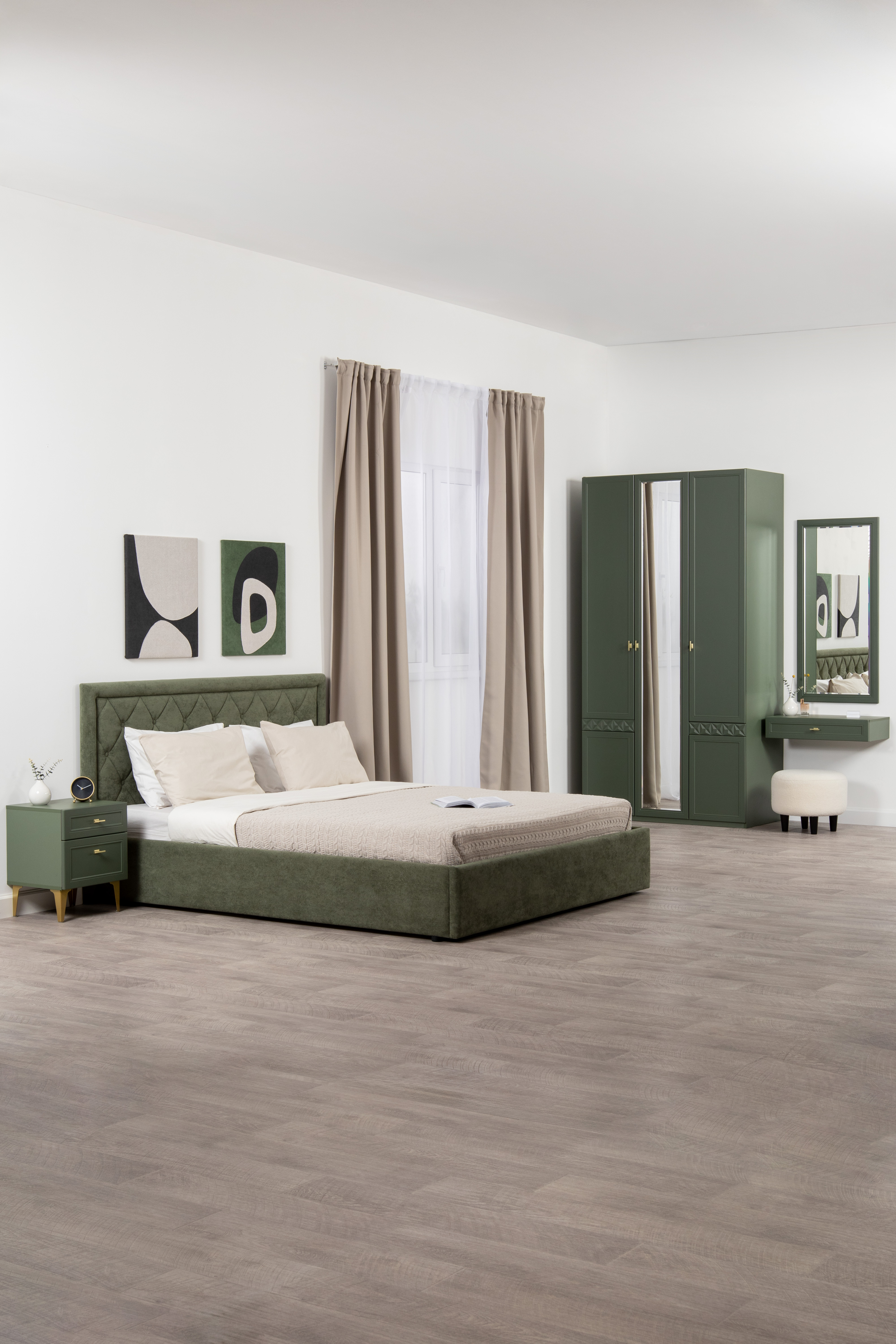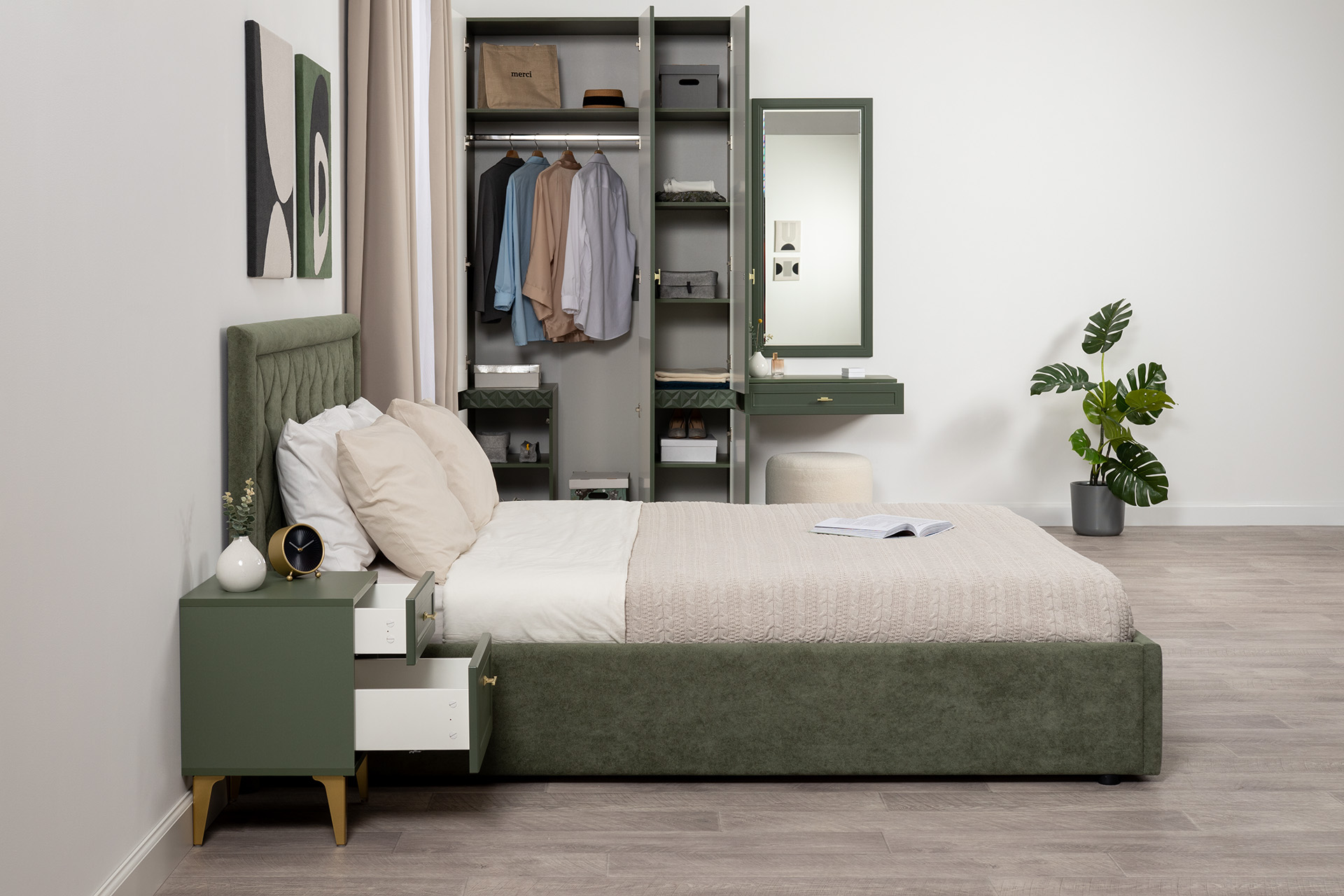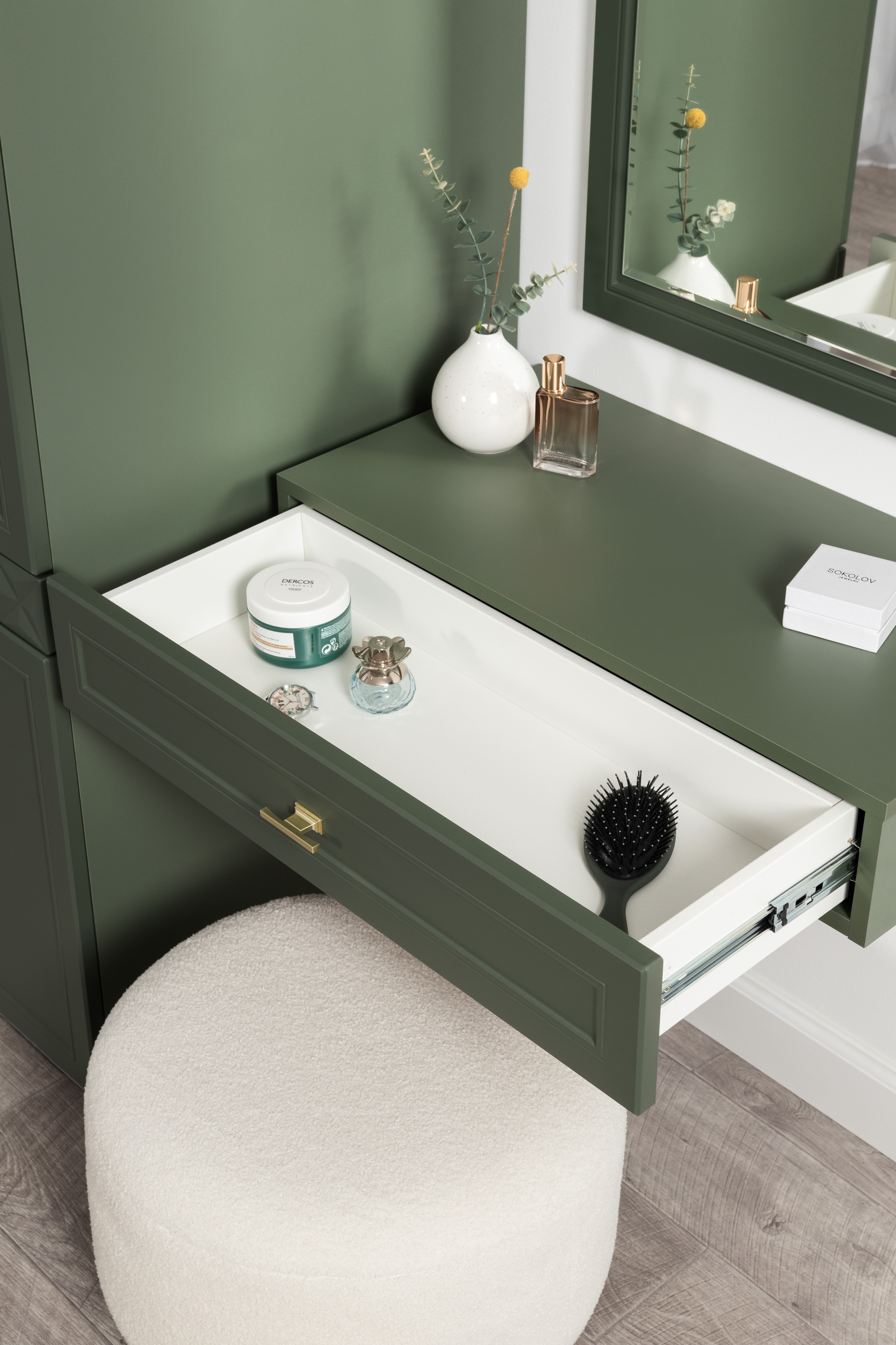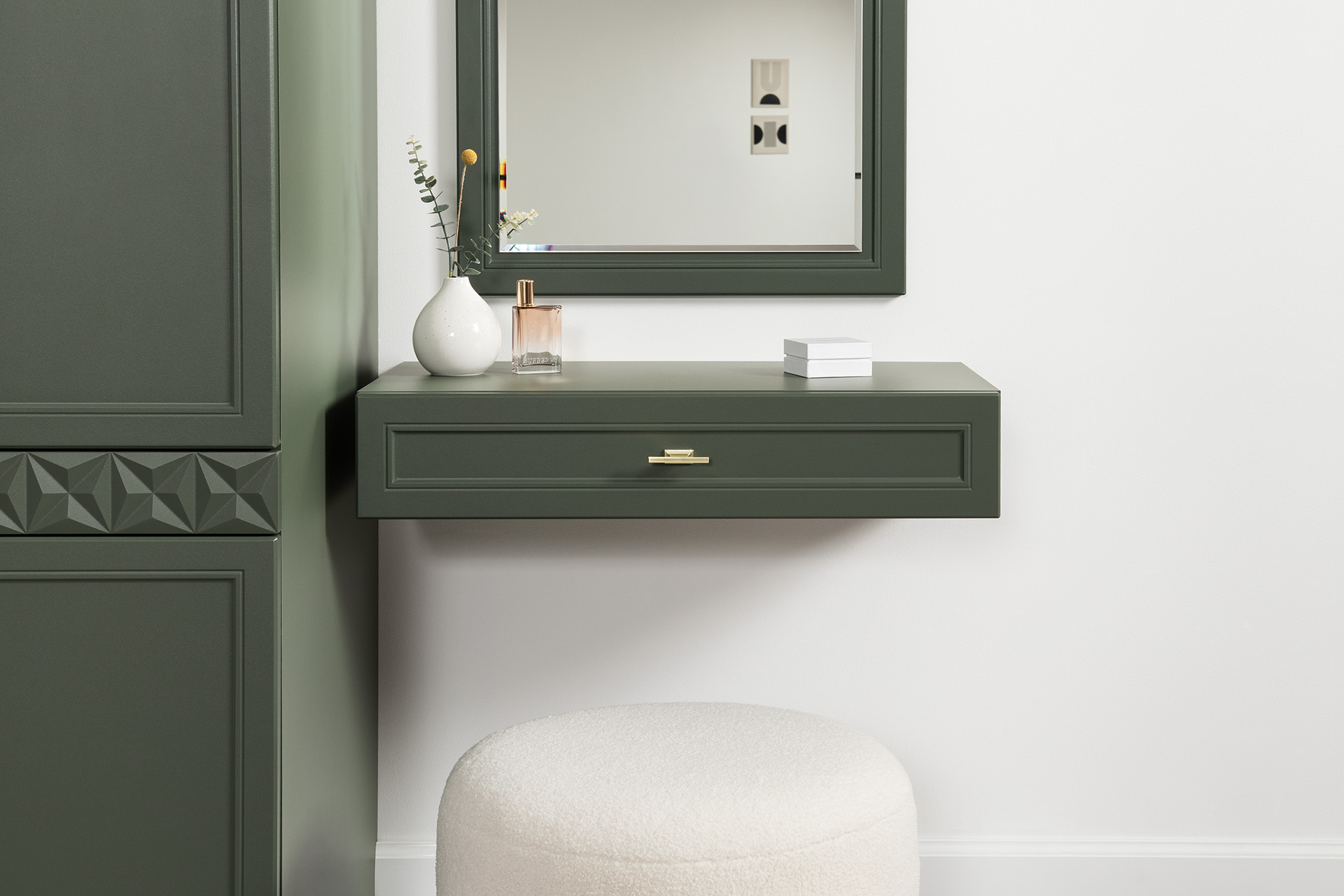 Изящные линии, глубокая фрезеровка фасадов из МДФ и благородные оттенки. Утончённая «Слоновая кость» и изысканная «Олива Шагрень» с глубоким зелёным тоном — создают атмосферу уюта, тепла и благородства. Металлические ручки и опоры золотого цвета придают мебели утончённый блеск, а петли и направляющие с доводчиками обеспечивают плавное и бесшумное закрытие фасадов.