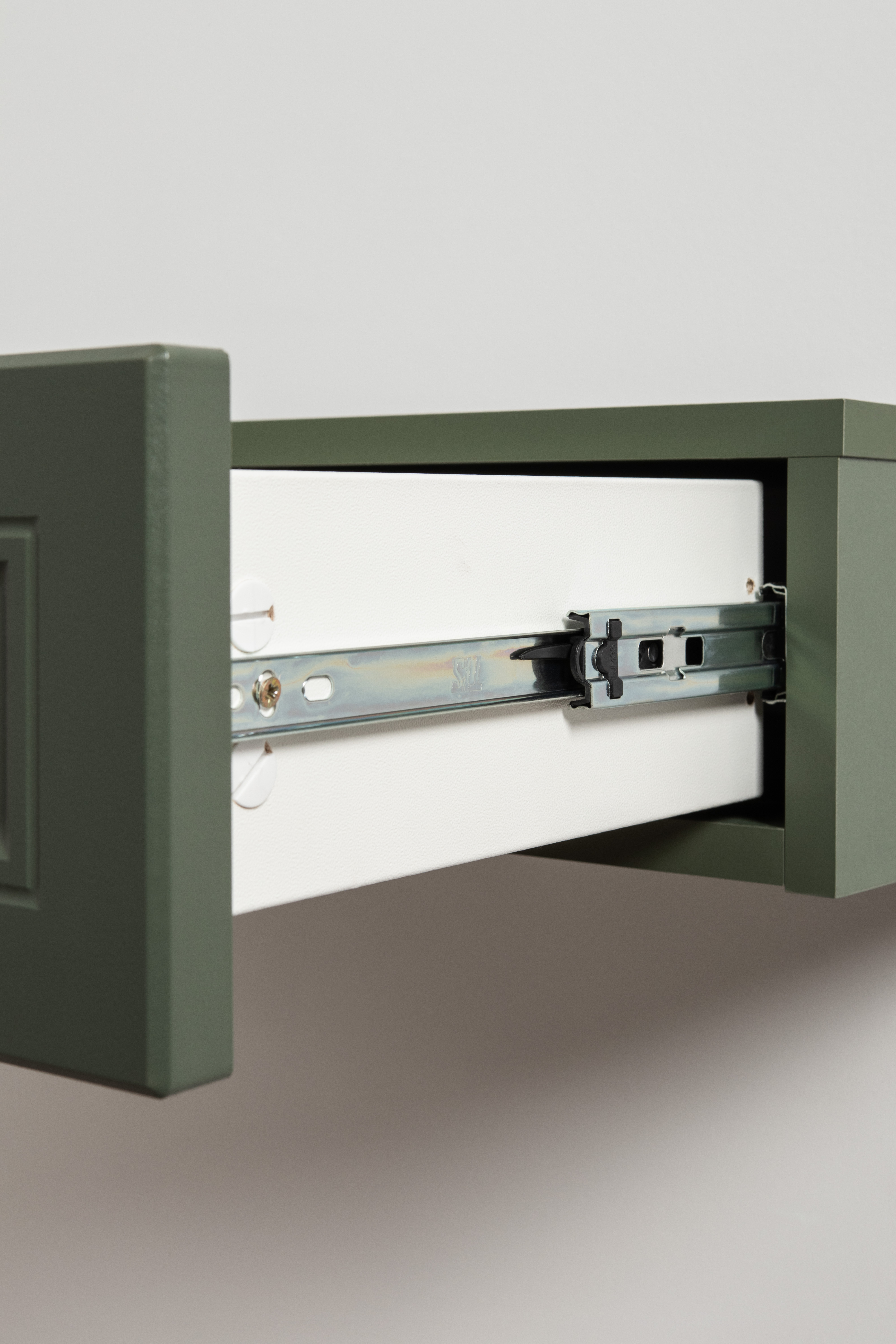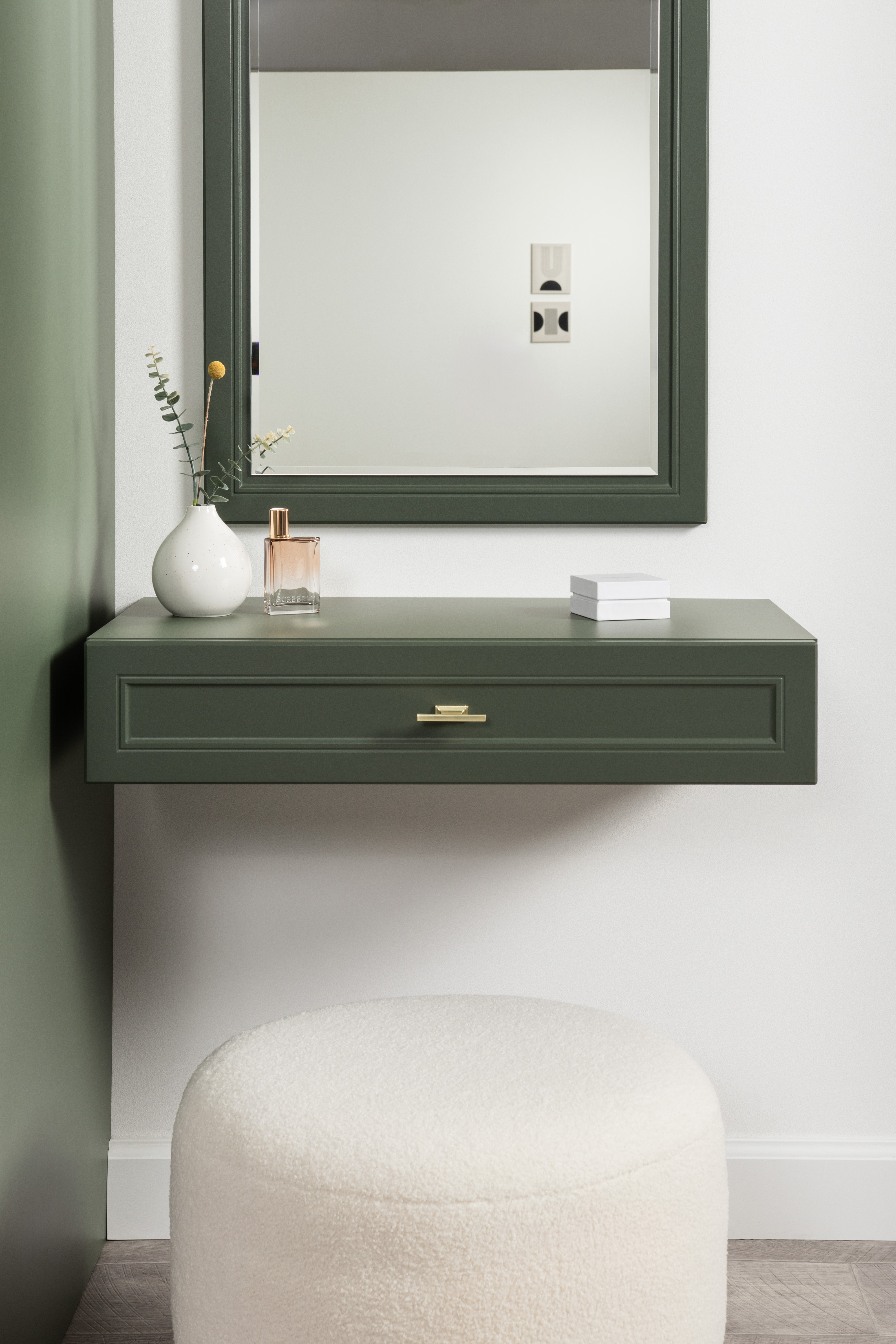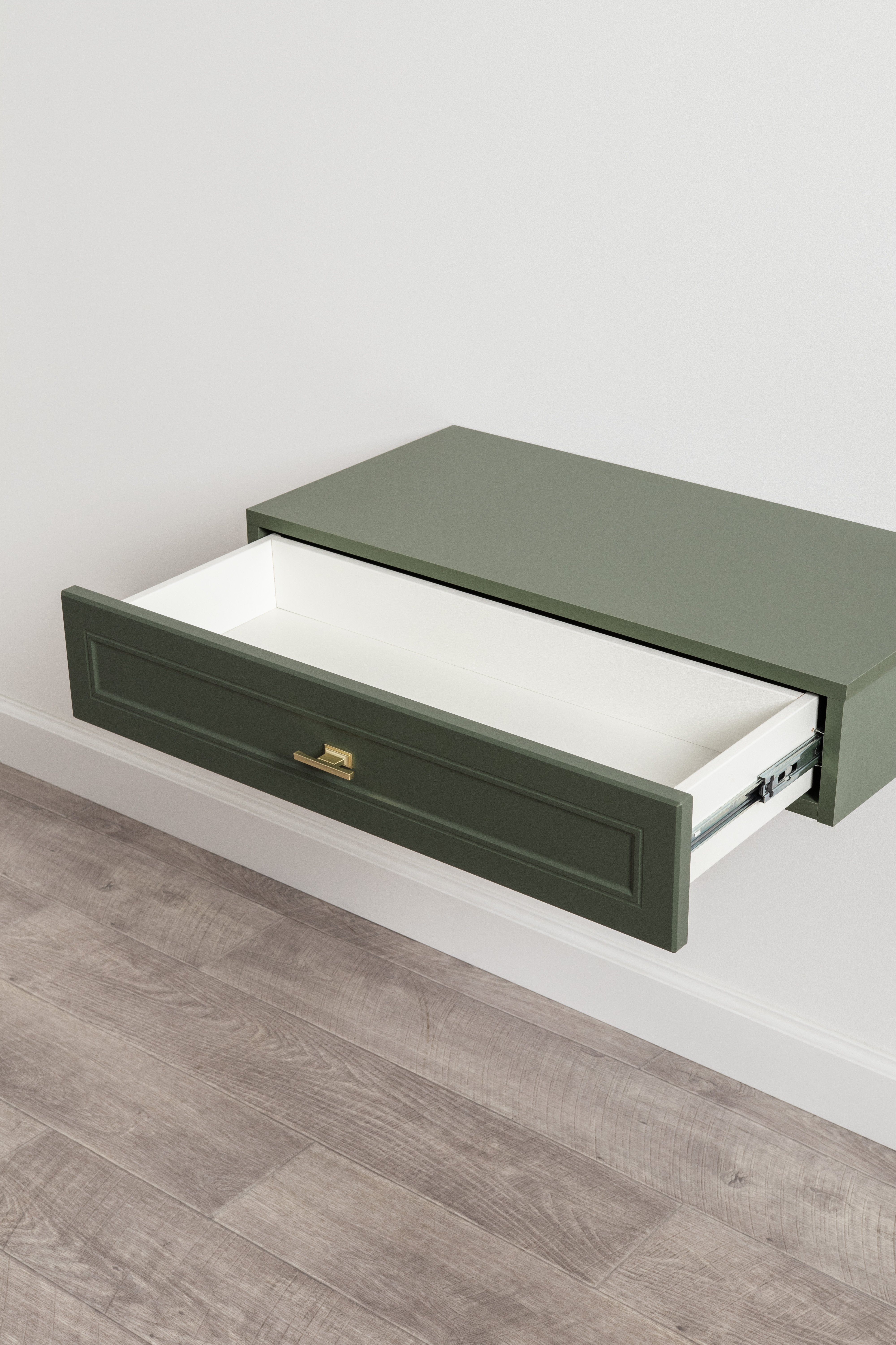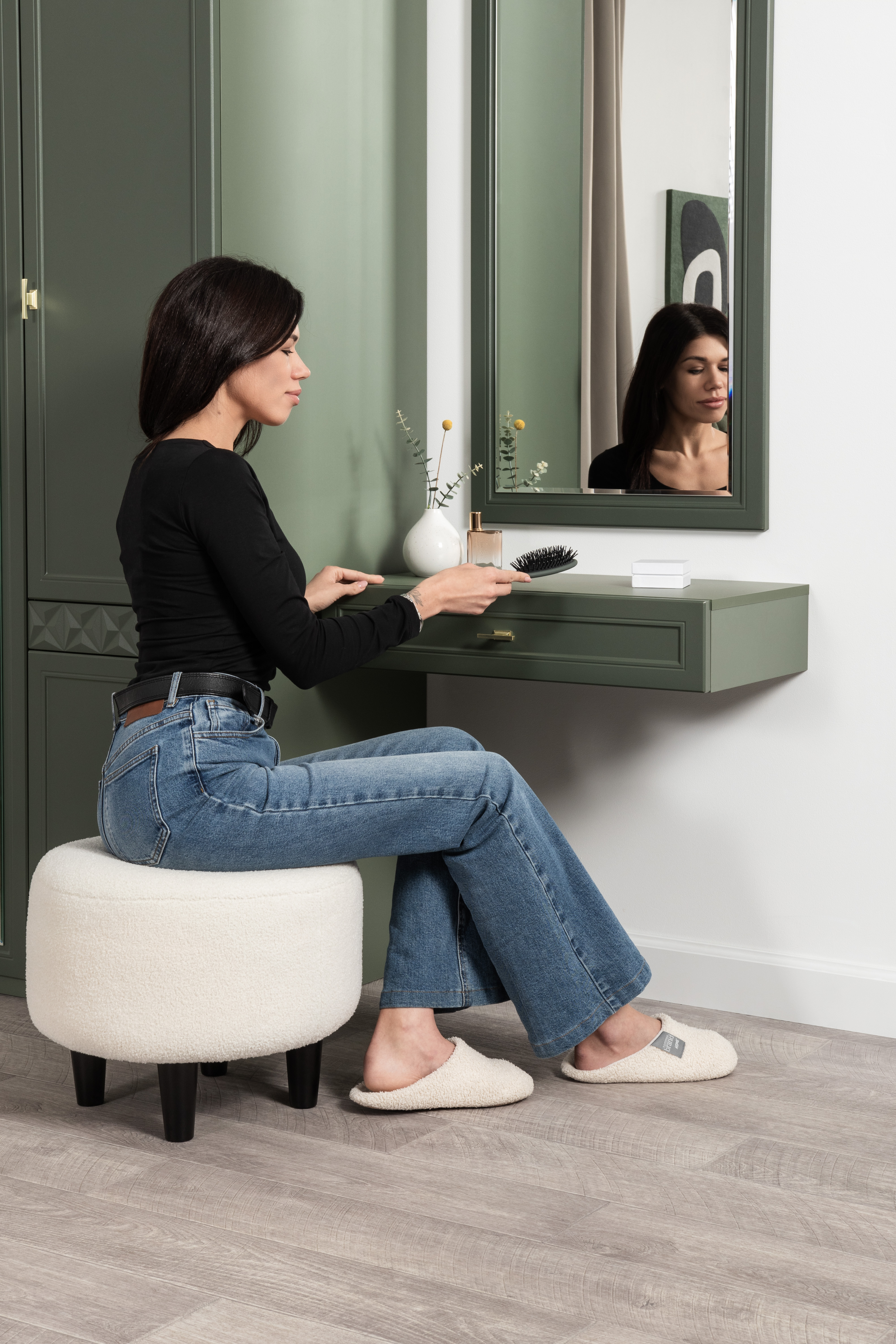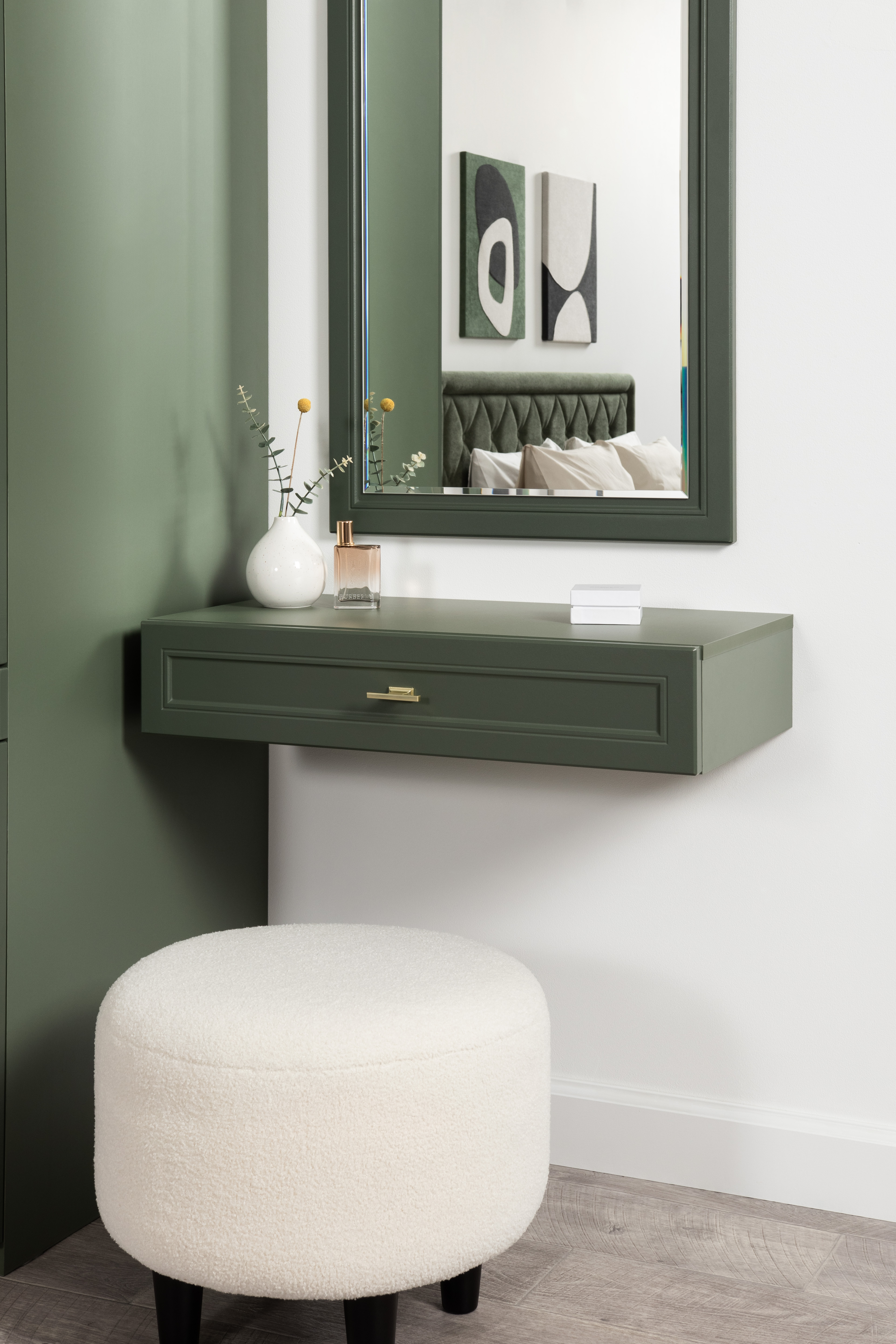 Изящные линии, глубокая фрезеровка фасадов из МДФ и благородные оттенки. Утончённая «Слоновая кость» и изысканная «Олива Шагрень» с глубоким зелёным тоном — создают атмосферу уюта, тепла и благородства. Металлические ручки и опоры золотого цвета придают мебели утончённый блеск, а петли и направляющие с доводчиками обеспечивают плавное и бесшумное закрытие фасадов.