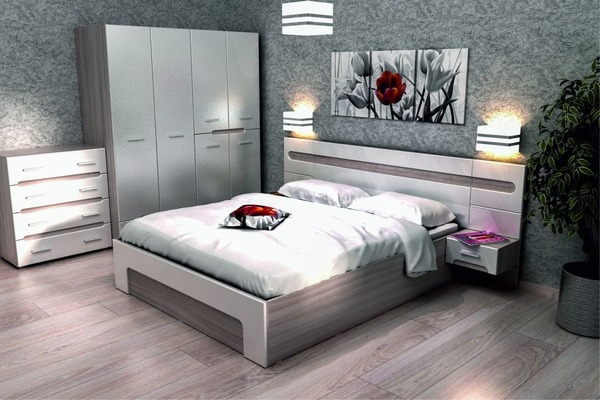 Современная кровать в стиле модерн украсит интерьер любой спальни, индивидуальность данной кровати - подвесные тумбы и изголовье представляют собой монолит. Белый глянец и корпус в цвете Ясень Шимо светлый оригинально смотрятся в сочетании трендовых цветов, такая кровать достойно представляет Вашу личную обитель в комплекте с комодом и шкафами.