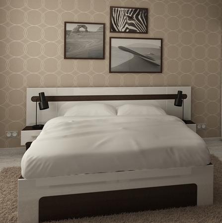 Современная кровать в стиле модерн украсит интерьер любой спальни, индивидуальность данной кровати - подвесные тумбы и изголовье представляют собой монолит. Белый глянец и корпус в цвете Венге Магия оригинально смотрятся на контрасте, такая кровать достойно представляет Вашу личную обитель в комплекте с комодом и шкафами.