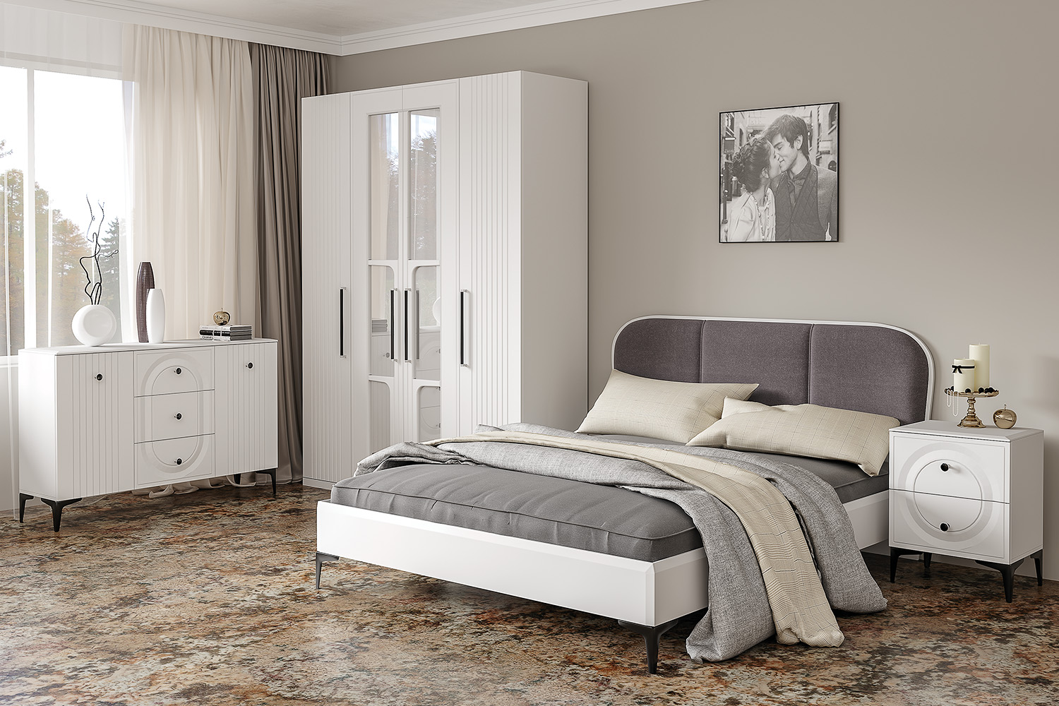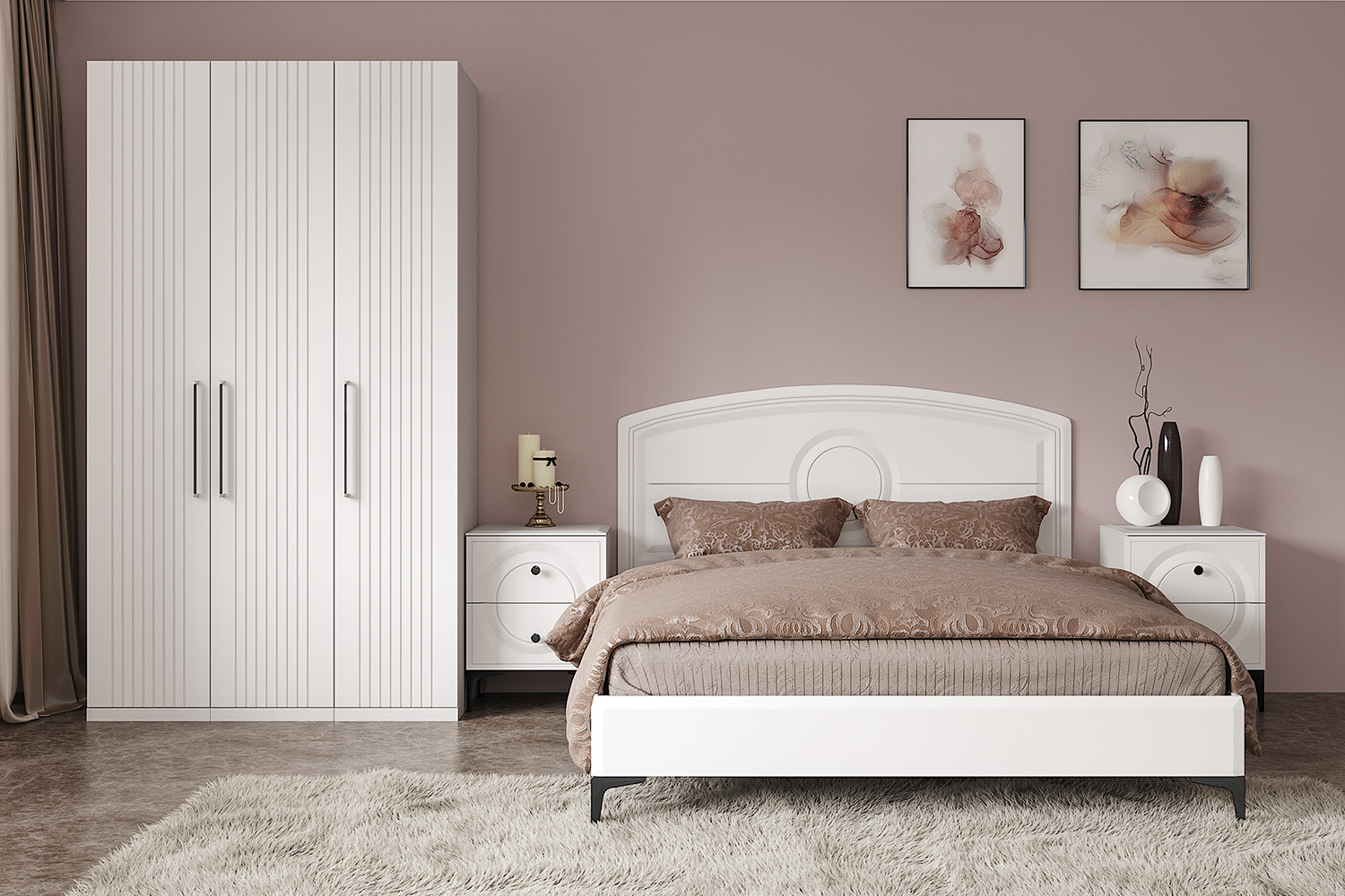 Основным декоративным элементом коллекции является круг. Явно представленный фрезеровкой по фасадам тумбы, комода, в изголовье кровати и ручках-кнопках.